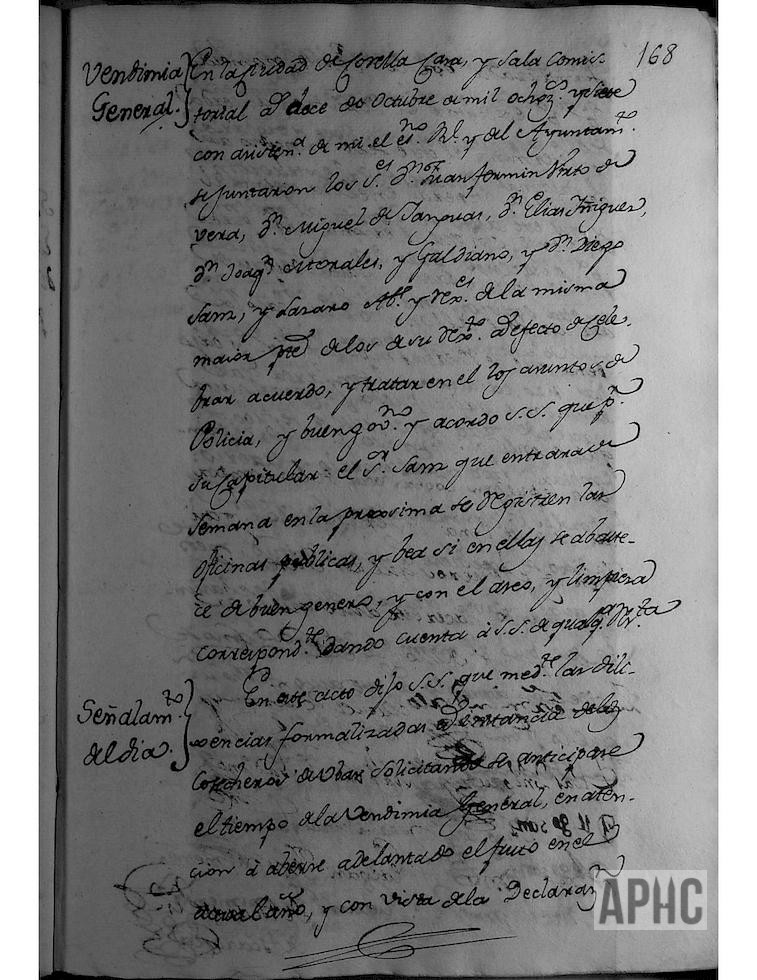 Entre otros asuntos, se señaló el día 20 del corriente para el comienzo de la vendimia general, sin que nadie pueda traer cantidades de fruto, hasta después de las 12 hora de dicho día, bajo las penas que pueda imponer el Regimiento y no se pueda racimar hasta que sea permitida.