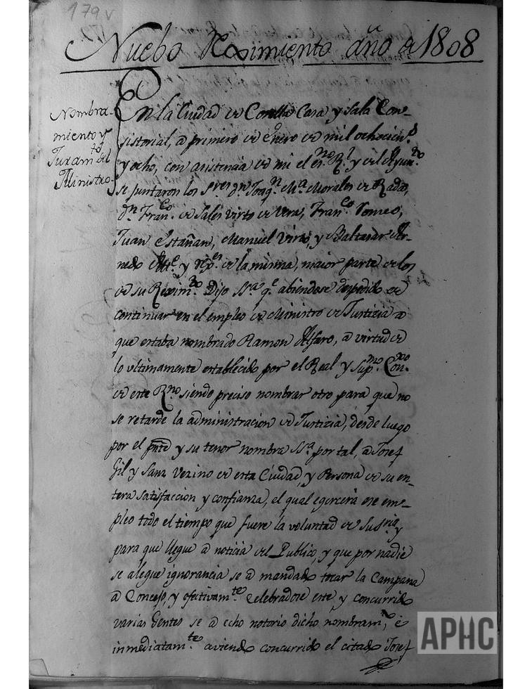 En la Ciudad de Corella, Casa y Sala Consistorial a 1º de enero de 1808, se juntaron los Sres. D. Joaquín Mª Morales de Rada y Galdiano, D. Francisco de Sales Virto de Vera, Francisco Romeo, Juan Estañán, Manuel Virto y Baltasar Arnedo, Alcalde y Regidores, (es también Regidor D. Pedro Altabas y Larraga) dijo su Señoría que, habiéndose despedido de su empleo el ministro de Justicia Ramón Alfaro, y por las consideraciones expuestas, se nombró para ministro de Justicia a Josef Gil y Sanz.
