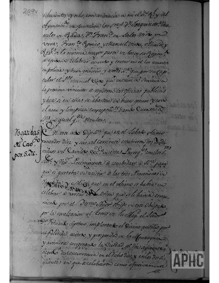 La Corporación asistió a las celebraciones religiosas, realizadas con motivo de la exaltación al trono del rey Fernando VII, a las que concurrieron vecinos y las cofradías con sus estandartes, ceremonias que parece se celebraron los días 17, 18 y 19 de abril, consistentes en tres procesiones y otras tantas misas.