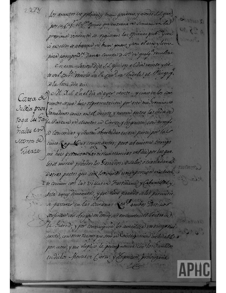 Entre otros asuntos, se acordó acceder por este año, a la solicitud del Gremio de Ganaderos de continuar, a partir del día 29 de Junio que finaliza el plazo, el pastoreo de sus ganados hasta el 20 de Julio, en los Montes de Cierzo y Argenzón por las buenas relaciones existentes entre las 5 localidades congozantes, por los inconvenientes de poder trasladar los ganados a una pequeña porción de terreno de las villas de Fustiñana y Cabanillas o a las Bardenas Reales, ambos destinos lindantes con Aragón, en donde se encuentra el “Teatro de la Guerra” (Guerra de la Independencia).