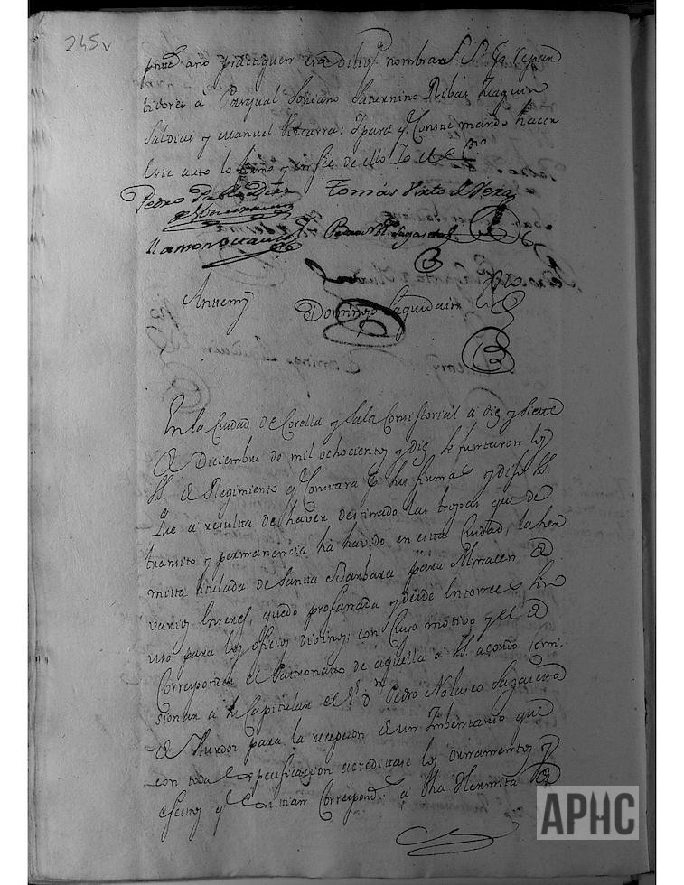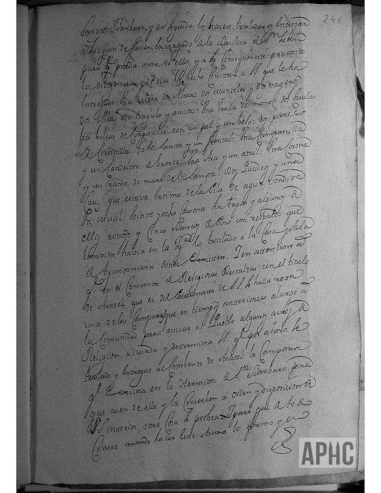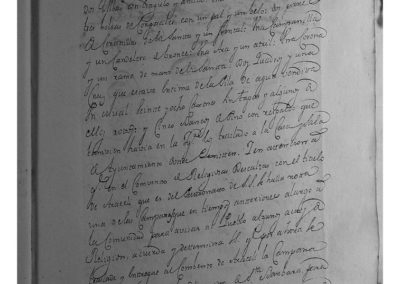 Se trató sobre la ocupación de la ermita de Santa Bárbara por las tropas tanto de tránsito como de permanencia, siendo profanada y quedando sin uso para el culto, encargando al Regidor Pedro Nolasco Sagaseta de Ilúrdoz la recepción de un inventario de los ornamentos y efectos correspondientes Ermita y se entregasen a Joaquín de Funes, encargado de la Basílica de San Juan, para que pueda usar los mismos, y se han entregado: 2 manteles y 2 bajeras; 2 albas con cíngulo; 1 toalla de mano; 2 casullas; 3 bolsas de corporales con un pal y un velo; 2 pares de cortinillas de la Santa y 1 frontal; 1 campanilla y 1 candelero de bronce; 1 ara y 1 atril; 1 corona y 1 ramo de mano de la Santa; 2 cuadros y 1 cruz, que estaba encima de la pila de agua bendita; 1 cirial; 28 cajones sin tapas y alguno de ellos rotos y 5 bancos de pino con respaldo de dicha iglesia que se han traslado a la Casa Consistorial. Y en atención al convento de Religiosas Descalzas con el título de Araceli, que es patronato de la Ciudad, está rota una de las campanas, se acuerda se le entregue la campana existente en dicha Ermita de Santa Bárbara, para que la usen y la conserven. (Este es el último acuerdo de este Libro).