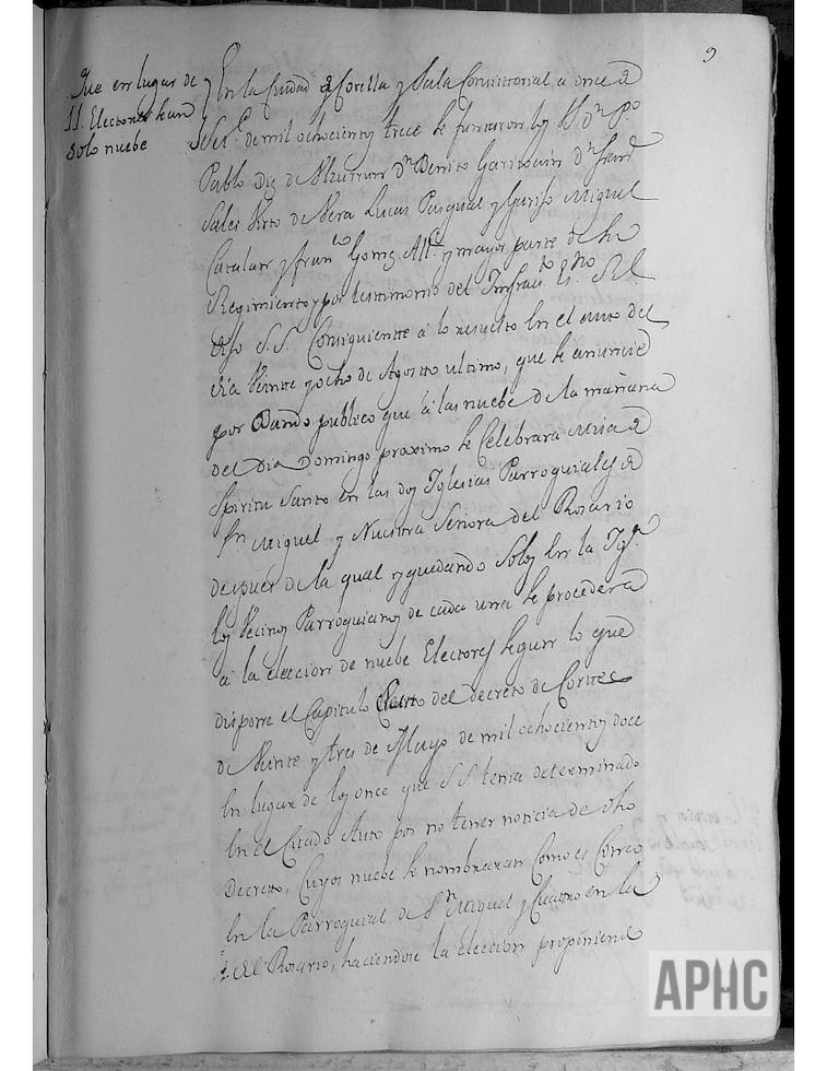 Según lo resuelto en acuerdo del día 28 de Agosto pasado, se acuerda se anuncie por banco público que el próximo domingo a las 9 de la mañana, se celebrará misa de Espíritu Santo, en las dos Iglesias Parroquiales de San Miguel y de Ntra. Sra. del Rosario, después de las cuales y por los vecinos parroquianos de cada una, se procederá a la elección de 9 electores, según el capítulo 4º del Decreto de Cortes de 23 de Mayo de 1812, en lugar de los 11 que se tenía determinado, eligiéndose 5 en la Parroquia de San Miguel y 4 en la de Ntra. Sra. del Rosario.