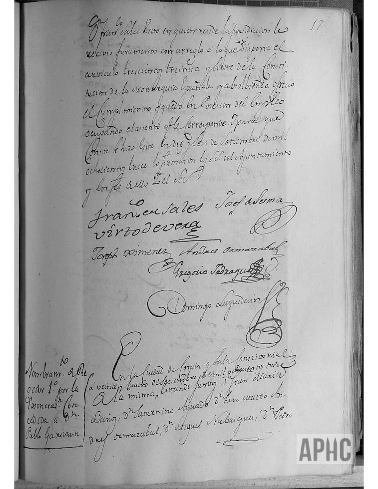 Estando juntos D. Francisco María Baños, D. Saturnino Aguado, D. Juan Mateo, Andrés Ormazábal, D. Miguel Navascués, D. Pedro Gil, D. Ramón Octavio de Toledo, Manuel Gil Ibarra y D. Manuel Gil Gómez, electores nombrados por las Parroquiales de esta Ciudad, que hicieron la nominación de individuos del Ayuntamiento Constitucional, dijeron que por Decreto del Jefe Político, de fecha 20 del corriente, exonera a D. Pablo Garisoain del cargo de Regidor primero, para el que fue nombrado, eligen y nombran en su lugar a D. Pedro Pablo Díez de Ulzurrun.