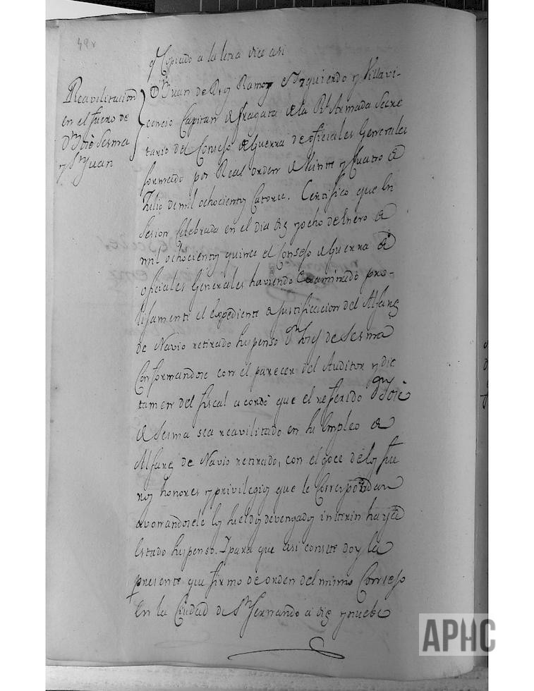 En esta sesión, se presentó D. Josef de Sesma y Sanjuán, y exhibió certificado expedido por el Secretario del Consejo de Guerra, en el que consta que con fecha 18 de enero del presente año, se le rehabilitó en su empleo de Alférez de Navío retirado, con el goce de los fueros, honores y privilegios que le correspondan. El Ayuntamiento queda enterado a los efectos oportunos.