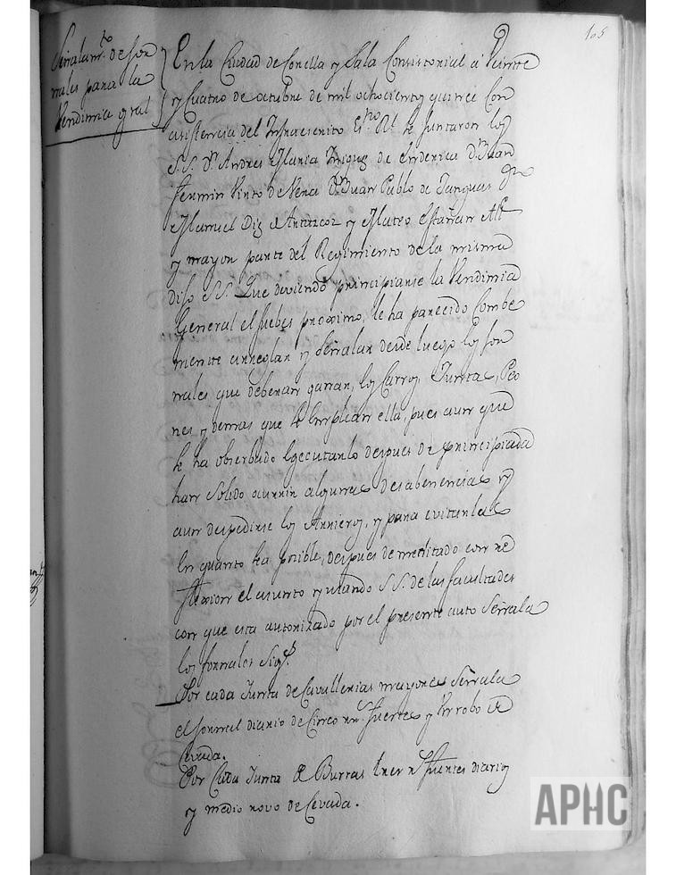 Se acordaron los precios de jornales de la vendimia, en la forma siguiente: Por cada yunta de caballerías mayores, se señala un jornal diario 5 reales fuertes y 1 robo de cebada. Por cada yunta de burras, 3 reales fuertes y medio robo de cebada. Por cada carro con dos mulas, 14 reales fuertes y 1 robo de cebada; y si el carro es de 3 mulas a 18 reales fuertes y 1 y medio robo de cebada. Por cada peón forastero de los que cortan uvas, 1 real y medio fuertes y por los peones del Pueblo a 1 peseta, y a los sobrestantes y pisadores, a 2 reales y medio fuertes diarios y la costa. Asimismo, se señala el precio de 11 pesetas (aquí se señala también la cantidad de 22 reales fuertes, entiendo que si es como equivalencia, lo moneda que aquí se cita como peseta, tiene 2 reales) por cada carga de uva con peso de 10 arrobas (133,920 Kg.), sin que nadie pueda excederse de los precios indicados.
