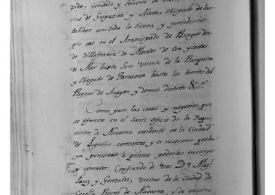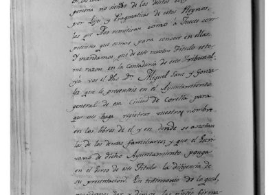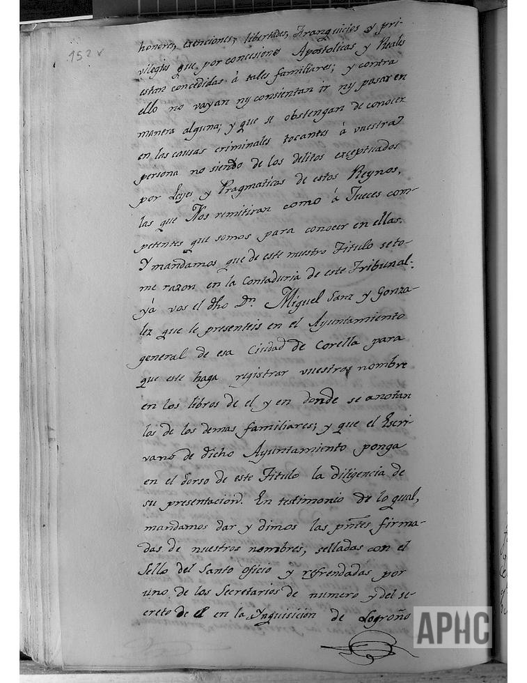 El escribano Real y del Ayuntamiento Domingo Laquidain, da fe de que, en esta fecha, comunica al Ayuntamiento, de la presentación del Título de Familiar del Santo Oficio de la Inquisición de este Reino de Navarra, a favor de D. Miguel Sanz y González, vecino de esta Ciudad, y se toma la correspondiente razón y copia en el Libro de Acuerdos.