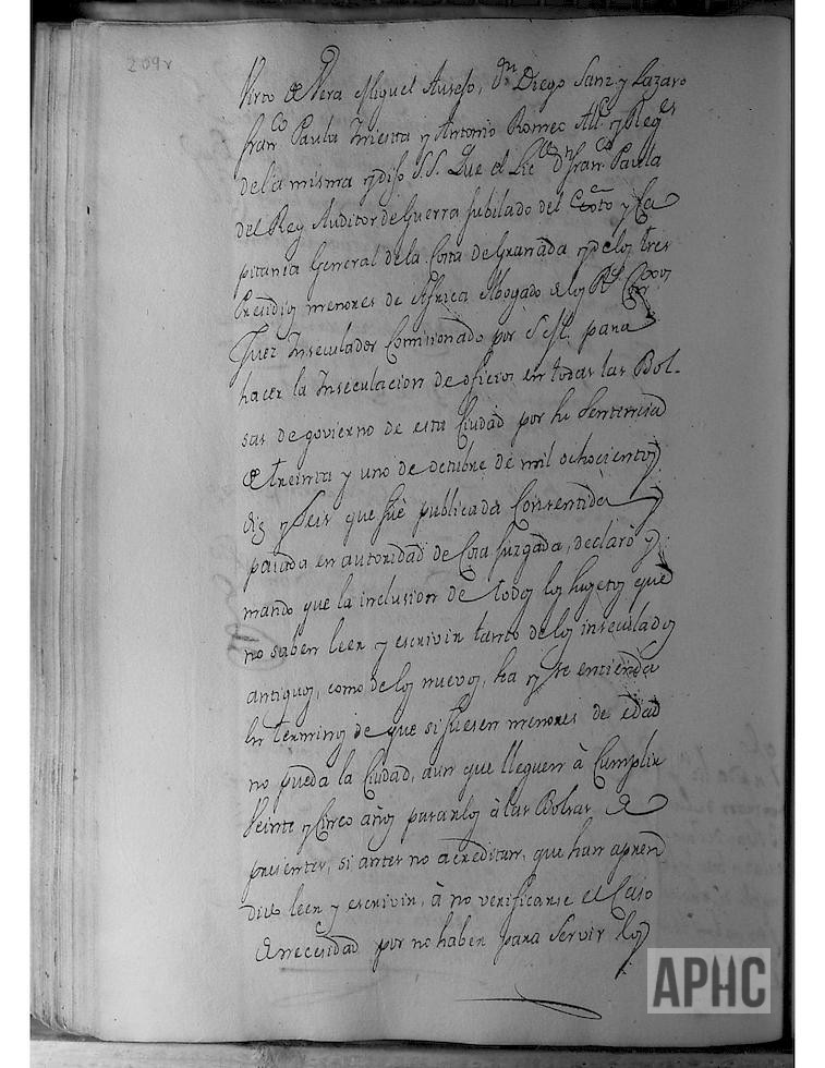 Se trató sobre lo dispuesto en la composición de las Bolsas de Insaculación para ejercer cargos de Gobierno de la Ciudad, pasando de la bolsa de presentes a la de ausentes los teruelos de los sujetos que no sepan leer ni escribir, tanto antiguos como nuevos, no pudiendo estar insaculados si son menores de edad, ni aun con 25 años si no saben leer ni escribir, y se acordó que por el Licenciado D. Francisco Paula del Rey, auditor de guerra jubilado del ejército y capitanía general de la costa de Granada, abogado y juez inseculador comisionado por Su Majestad, y el Licenciado D. Tomás Virto de Vera, sustituto fiscal, se trasladen a las Bolsas de ausentes, los teruelos de los sujetos que crean que no saben leer y escribir, entre tanto se habiliten con dicho requisito y lo hagan constar, y se solicite su confirmación al Real y Supremo Consejo.