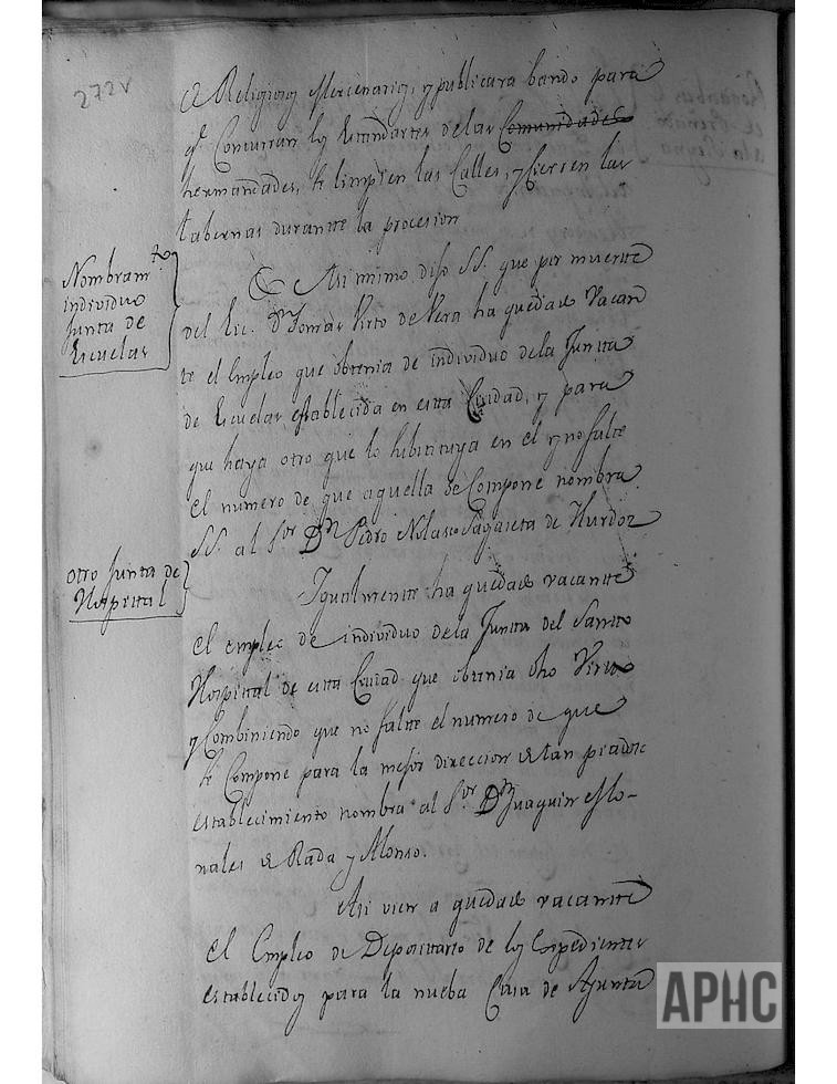 Entre otros asuntos, se nombra como individuo (representante) en la Junta de Escuelas a D. Pedro Nolasco Sagaseta de Ilúrdoz, por fallecimiento de D. Tomás Virto de Vera. Igualmente se nombra como individuo de la Junta del Santo Hospital a D. Joaquín Morales de Rada y Alonso, por fallecimiento de D. Tomás Virto de Vera. Igualmente se nombra a D. Francisco de Sales Iriarte, depositario para el expediente establecido para la nueva Casa de Ayuntamiento, por muerte de D. Tomás Virto de Vera.