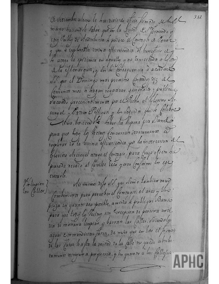 Ante la notificación Real, haciendo saber de que la ciudad de San Fernando y otros Pueblos de Andalucía, se padece el contagio de la peste, se acuerda se hagan rogativas, para implorar la intercesión del Glorioso San Miguel. Para precaver el contagio, mediante el aseo y limpieza en cuanto sea posible, se acuerda la publicación de bando, para que todas las personas limpien y barran las calles, sacando las aguas fuera, dejando el frontis y hasta mitad de la calle sin porquería alguna y que en cuanto a las callejas cerradas, con puertas a las plazas y calles públicas, que por ahora, se tiene presente las hay en casa de Antonio Serrano, D. Miguel Sopranis, D. Miguel Sanz González, D. Miguel Guesca, D. Miguel Escudero y cualesquiera otras aunque no se citen, se practicará la misma diligencia, y en adelante se limpiarán los martes y sábado de cada semana, teniendo abiertas las puertas de dichas callejas, para que puedan ser revisadas por las Regidores comisionados a este efecto.