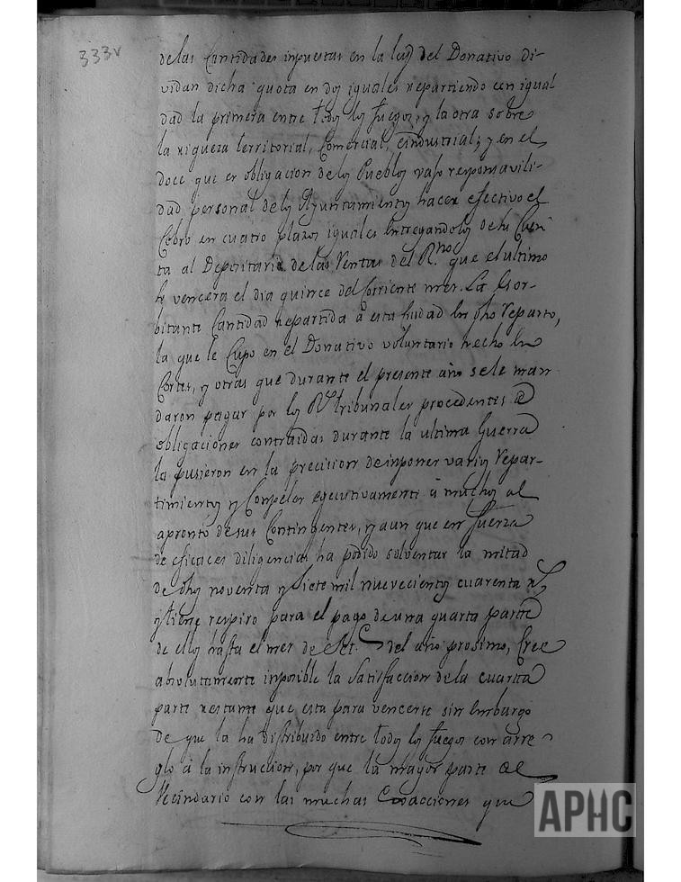 Se informa de que en el capítulo 1º de la instrucción remitida a los pueblos, sobre la contribución para el donativo Real, se distribuya dicha cuota en dos partes iguales, repartiendo con igualdad una parte entre todos los fuegos de los pueblos, y la otra mitad, sobre la riqueza territorial, comercial e industrial y ante las dificultades para poder abonar la cantidades impuestas en los plazos establecidos, se acuerda solicitar facultad al Supremo Consejo para proceder a la venta de unos 800 robos de trigo, de las Rentas y Censos de la Ciudad.