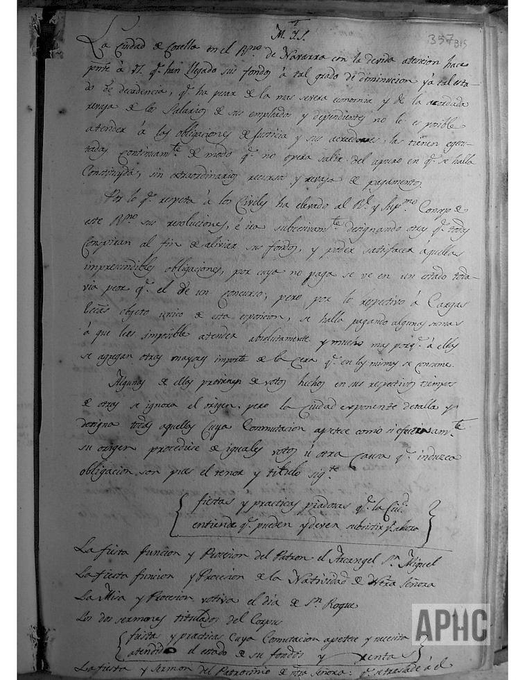 Se solicita y comunica a las autoridades del Obispado, la subsistencia y supresión de celebración de festividades y funciones religiosas, por escasez de fondos municipales. Se propone que subsistan las celebraciones de: La fiesta, función y procesión del Patrón el Arcángel San Miguel; la fiesta, función y procesión de la Natividad de Ntra. Señora; la misa y procesión votiva el día de San Roque; los dos sermones titulados del Corpus. Conmutación de fiestas y prácticas religiosas: La fiesta y sermón del Patrocinio de Ntra. Señora, que se traslade al de la Asunción; la fiesta de San Matías, que se conmute en la asistencia de la Ciudad en la misa mayor y sermón que tiene ese mismo día la Cofradía; la procesión y misa de Santa Lucía, que se conmute en la asistencia de la Ciudad a la misa el domingo inmediato; las procesiones y misas de San Bernardo, Santa Bárbara, el 3 de Junio “Pan y Queso” y “Yergada”, conmutarse en la asistencia de la Ciudad a la misa popular en los mismos días; la misa con Expuesto votada el 18 de Marzo por el terremoto, que se conmute por la Asistencia de la Ciudad, a la misa de San José.