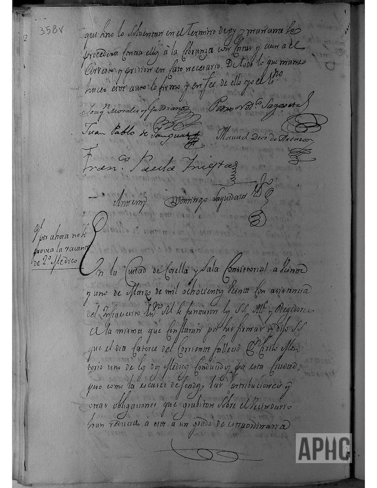 Habiendo fallecido, el día 14 del presente mes, D. Cirilo Montorio, médico de esta Ciudad, y debido a la escasez de fondos por los que atraviesa el Ayuntamiento, se acuerda suprimir dicha vacante, y que sólo haya un médico y que se le haga saber al otro médico D. Martín Igúzquiza, para que tome a su cuidado la visita y atención de todos los enfermos, en tanto fuere la voluntad de su Señoría.