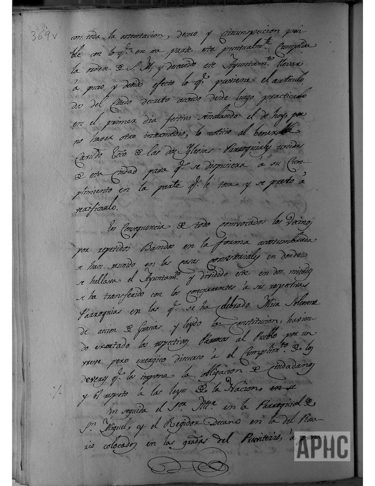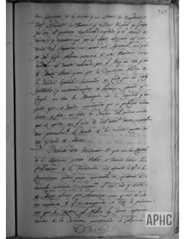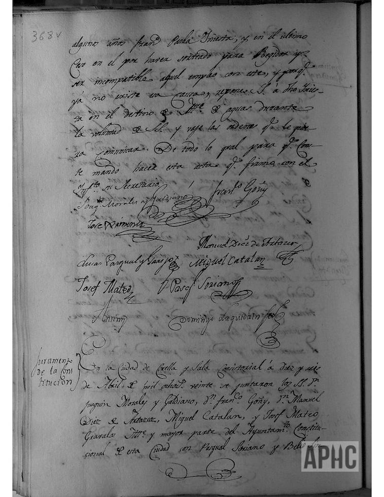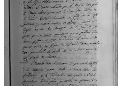 Se recibe oficio del Jefe Político interino de esta Provincia, con el decreto rubricado por el Rey, para que la Constitución Política de la Nación Española, sancionada en Cádiz por las Cortes Generales, se obedezca, guarde y cumpla en toda la Monarquía con la dignidad y respeto debido, mandando nuevamente su publicación y se jure en toda la Nación, del mismo modo que se ejecutó en el año 1812. Deseando este Ayuntamiento, cumplir con lo mandado, acordó realizarlo en el primer día festivo, señalando el de hoy, y se notició al Cabildo Eclesiástico de ambas Parroquias, para que se dispusieran a su cumplimiento, en la parte que les toca. Los miembros del Ayuntamiento, se dividieron en dos mitades y acudieron a sus respectivas Parroquias, donde se celebró misa solemne, se leyó la Constitución y los Párrocos predicaron un discurso alusivo al acto. El Sr. Alcalde, en la parroquia de San Miguel, y el Regidor Decano, en la del Rosario, colocados en las gradas del presbiterio, en presencia del pueblo y clero secular, puestas las manos sobre los santos Evangelios elevando la voz, pronunciaron la fórmula del juramento, que fue respondida y se finalizó el acto cantando un Te Deum.