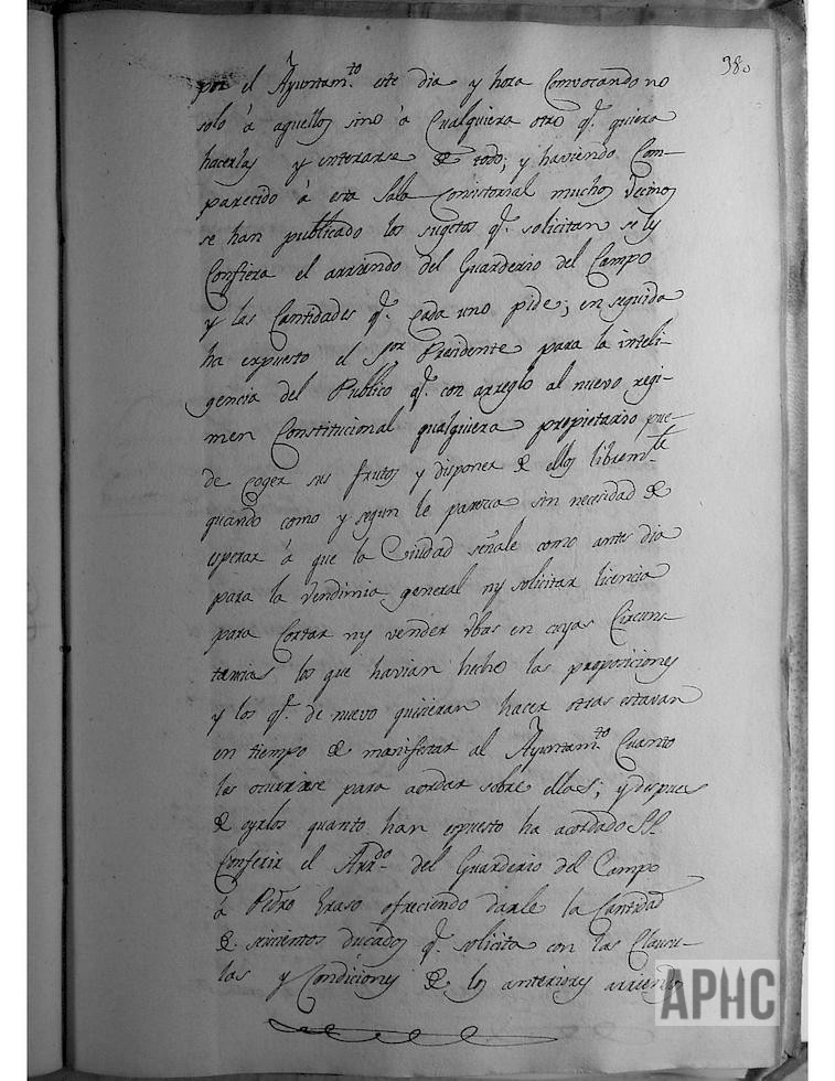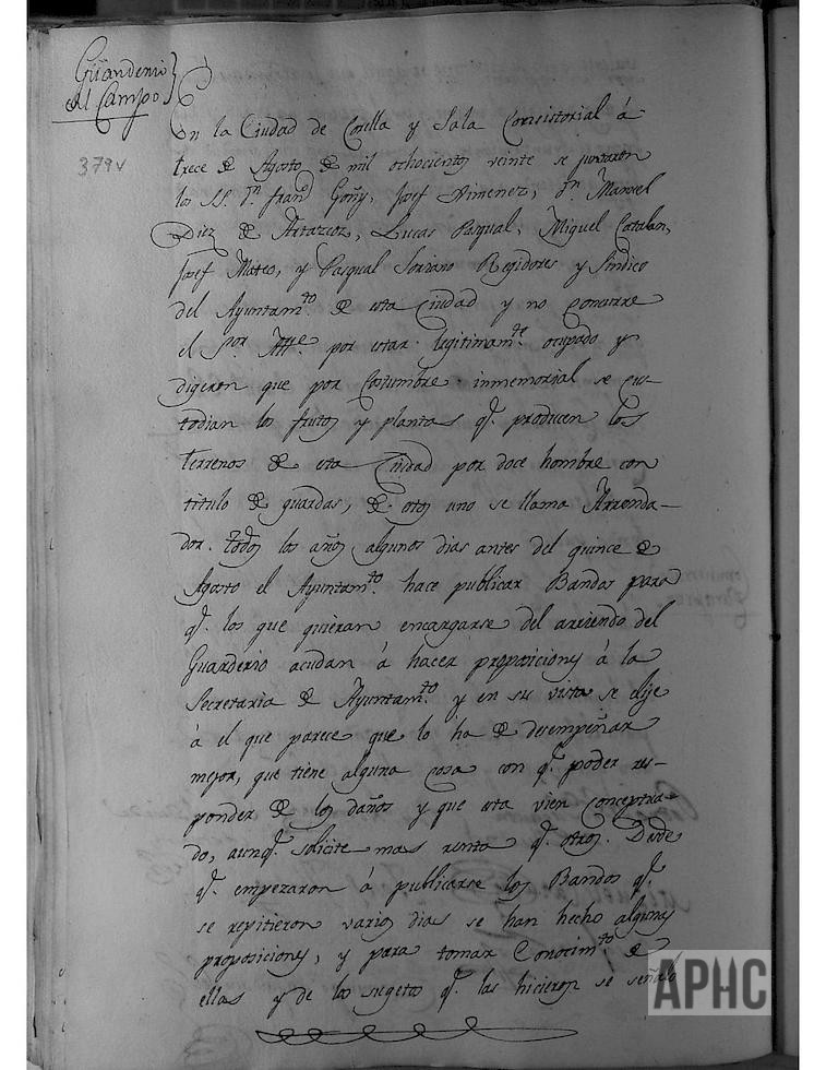 Se expone que, de costumbre inmemorial, se custodian los frutos y plantas que producen los terrenos de esta Ciudad, por 12 hombres con título de Guardas, uno de ellos se llama Arrendador. Todos los años unos días antes del 15 de Agosto, el Ayuntamiento publica bandos para que quien quiera encargarse de dicho Guarderío, presente proposiciones en la Secretaría del mismo, y después de estudiar varias, se acuerda conferir el Arriendo del Guarderío de Campo a Pedro Eraso, ofreciendo darle 600 ducados, en las condiciones establecidas anteriormente y teniendo presente que de conformidad con el nuevo orden constitucional, cualquier propietario puede recoger sus frutos y disponer de los mismos, sin esperar a que la Ciudad señale, como antes, día para la vendimia general, ni solicitar licencia para cortar ni vender uvas. Se acuerda que las multas establecidas a los que sean aprehendidos y denunciados por quebrantan las ordenanzas de Campo, se les impongan las penas dobles a las señaladas hasta ahora.