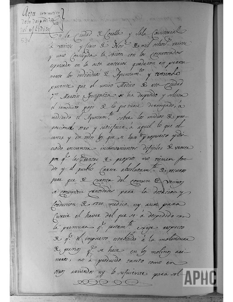 Se informa de que el único médico de la Ciudad, Martín Igúzquiza, se ha despedido y solicita se le abone, de inmediato, lo que se le debe. Se acuerdan medidas para poder abonarle dicha cantidad, dada la precariedad por la que atraviesa la Ciudad, y se trata sobre provisión de esta vacante y forma de admitir a uno nuevo.
