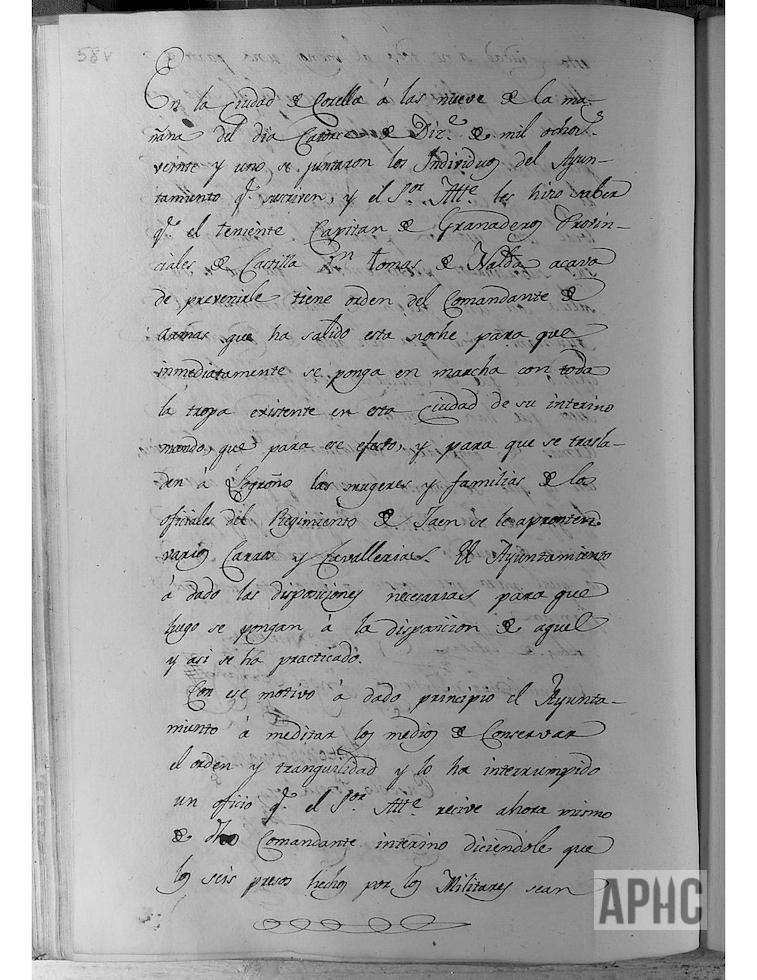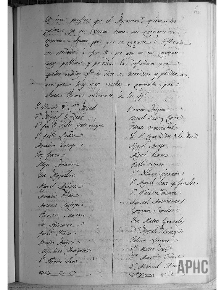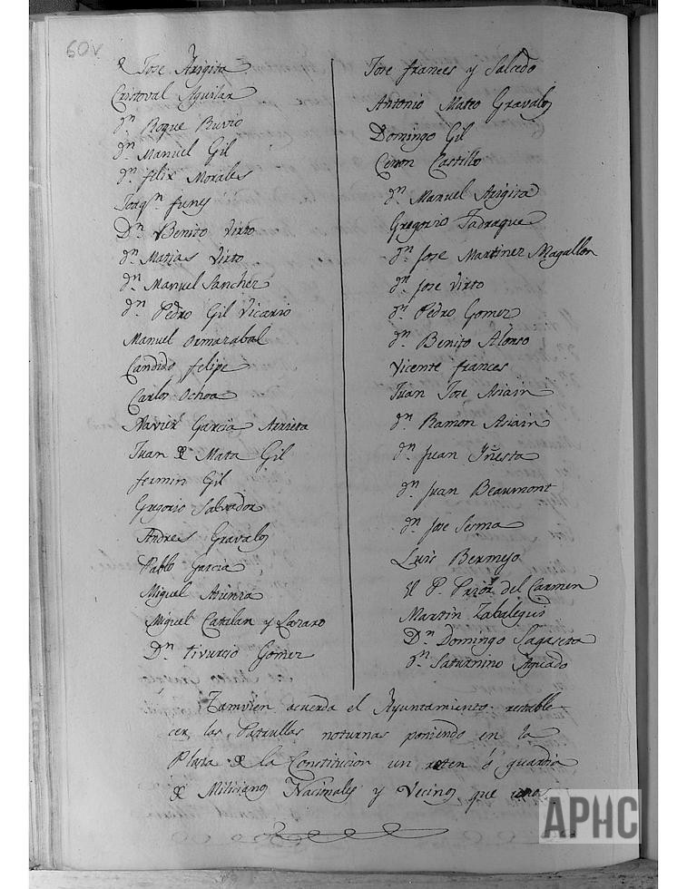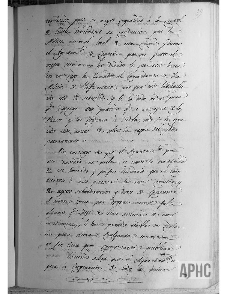 Se informa de que por D. Tomás de Nalda, capitán de los Granaderos Provinciales de Castilla y comandante militar de la tropa establecida en la Ciudad, se ha comunicado que esta noche abandonará la Ciudad y se marcharán a Logroño. Se acuerdan ciertas medidas preventivas para conrvar el orden público y para mantener una reunión tendente a difundir y observar el orden, se convoca a los señores: El Vicario de San Miguel, D. Miguel Escudero, D. Francisco Sales Virto mayor, D. Francisco Ágreda, Mauricio Zatoya, José García, Alejo Asiain, José Magallón, Miguel Arigita, Antonio Ochoa, Antonio Arriaga, Ramón Moreno, José Jiménez, Francisco Inesta, Benito Arigita, Alejandro Igúzquiza, D. Javier Sanz, Ramón Arigita, Miguel Virto Cueva, Andrés Ormazábal, el Padre Comendador de la Merced, Miguel Ausejo, Miguel Romeo, Pablo Virto, D. Nolasco Sagaseta, D. Miguel Sanz González, D. Pedro Iriarte, Manuel Antoñanzas, Esteban Sánchez, José Mateo Grávalos, D. Miguel Navascués, Julián Vicente, D. Mateo Nos, D. Martín Indave, D. Manuel Tellería, José Arigita, Cristóbal Aguilar, D. Roque Rubio, D. Manuel Gil, D. Félix Morales, Joaquín Funes, D. Benito Virto, D. Matías Virto, D. Manuel Sánchez, D. Pedro Gil Vicario, Manuel Ormazábal, Cándido Felipe, Carlos Ochoa, Javier García Arrieta, Juan de Mata Gil, Fermín Gil, Gregorio Salvador, Andrés Grávalos, Pablo García, Miguel Atienza, Miguel Catalán Lázaro, D. Tiburcio Gómez, José Francés Salcedo, Antonio Mateo Grávalos, Domingo Gil, Zenón Castillo, D. Manuel Arigita, Gregorio Jadraque, D. José Martínez Magallón, D. José Virto, D. Pedro Gómez, D. Benito Alonso, Vicente Francés, Juan José Asiain, D. Ramón Asiain, D. Juan Inesta, D. Juan Beaumont, D. José Sesma, Luis Bermejo, Padre Prior del Carmen, Martín Zabalegui, D. Domingo Sagaseta y D. Saturnino Aguado. Se acuerda restablecer las patrullas nocturnas, poniendo en la Plaza de la Constitución un retén o guardia de Milicianos Nacionales y Vecinos, que estarán a las órdenes del Individuo de Ayuntamiento o el Oficial de la Milicia, porque alternarán entre estos, haciendo servicio desde las 5 de la tarde hasta las 7 de la mañana.