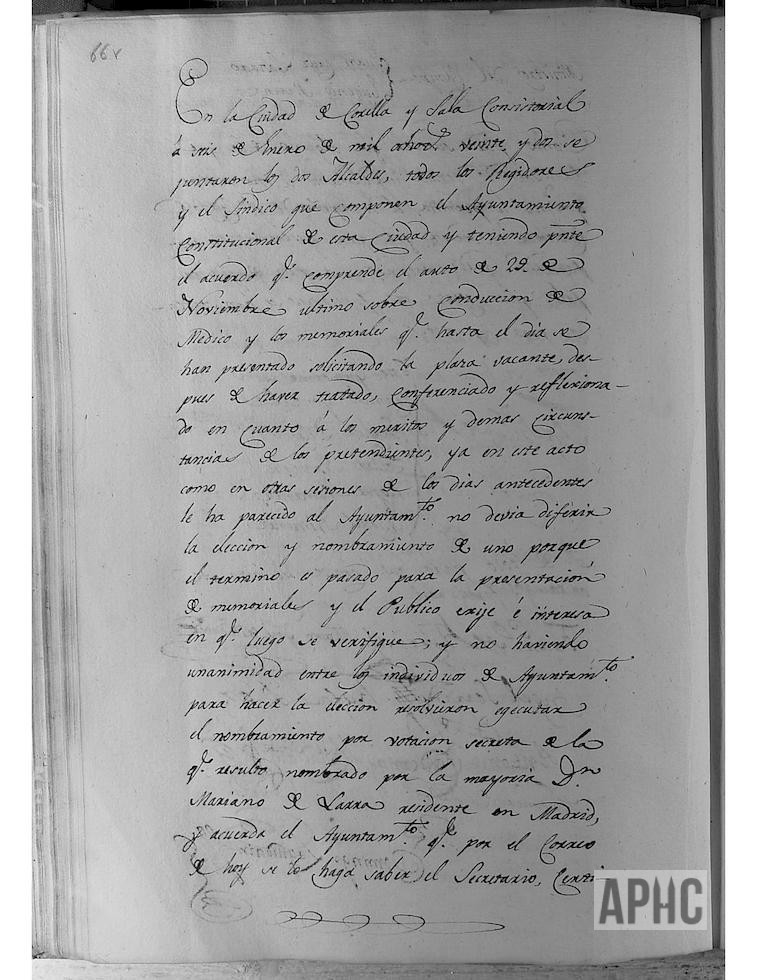 Por estar vacante el cargo de médico, una vez examinados los memoriales presentados y realizada la oportuna votación, se acordó el nombramiento para el empleo de Médico a D. Mariano de Larra, residente en Madrid, y que por correo se le comunique, señalando el plazo de 15 días para su traslado a esta Ciudad. (Mariano de Larra es padre del poeta Mariano José de Larra y Sánchez de Castro).
