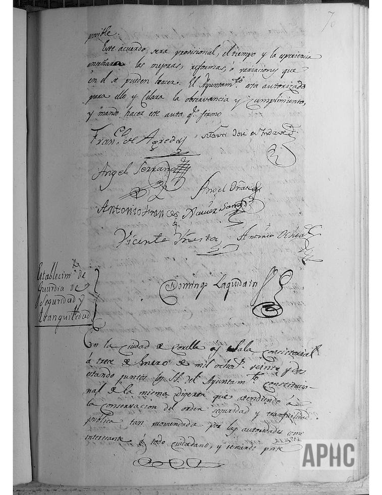 Por las consideraciones que en este auto se determinan, se acordó que, el servicio de principal de guardia, establecido en la Plaza de la Constitución, se realice por todo el vecindario, según el orden de empadronamiento y por la Milicia Nacional, y se dictan disposiciones sobre el tema.