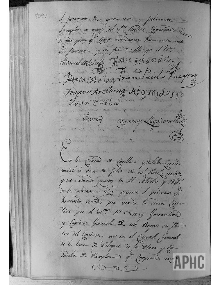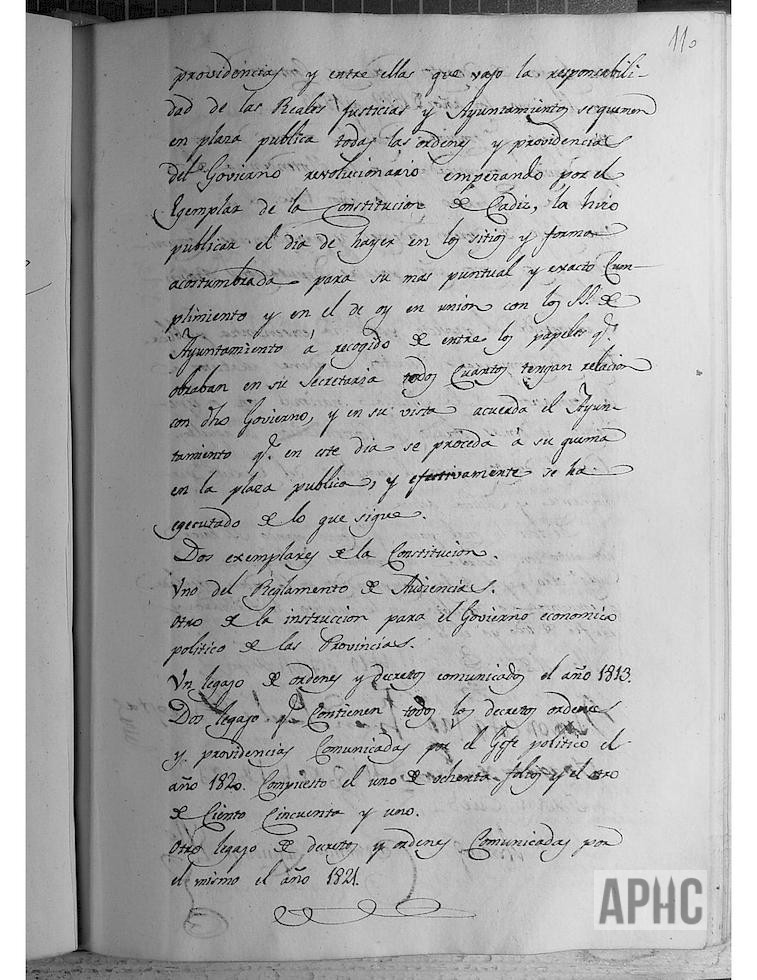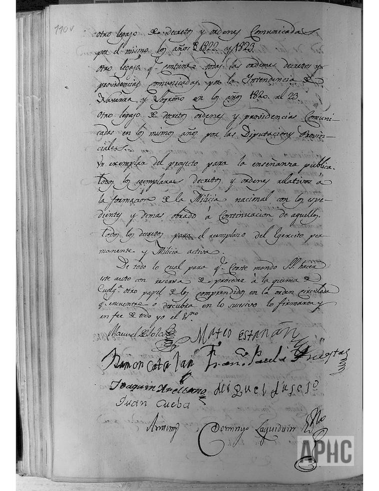 Por orden del Excmo. Sr. Virrey, Gobernador y Capitán General de este Reino, se manda que bajo la responsabilidad de las Reales Justicias y Ayuntamientos, se quemen en Plaza Pública, todas las órdenes y providencias del Gobierno Revolucionario, empezando por el ejemplar de la Constitución de Cádiz, y en su cumplimiento, por los señores de Ayuntamiento, se procedió a la recogida de entre los papeles obrantes en la Secretaría a los que tenían relación con dicho Gobierno, procediendo a la quema, entre otros de: Dos ejemplares de la Constitución; un Reglamento de Audiencias; otro de la instrucción para el Gobierno económico-político de las Provincias; un legajo y órdenes y decretos comunicados en 1813; dos legajos con las órdenes y providencias comunicadas por el Jefe Político el año 1820, compuestos uno de 80 folios y el otro de 151; otro legajo de órdenes comunicadas por el mismo, en 1821; otro legajo de decretos y órdenes comunicadas por el mismo los años de 1822 y 1823; otro legajo que contiene todas las órdenes, decretos y providencias, comunicadas por la Intendencia de Navarra y Logroño, en los años de 1820 al 23; otro legajo de decretos, órdenes y providencias, comunicadas en los mismos años, por las Diputaciones Provinciales; un ejemplar del proyecto para la enseñanza pública; todos los ejemplares, decretos y órdenes, relativos a la formación de la Milicia nacional, con los expedientes y demás, obrado a continuación de aquellos; todos los decretos para el reemplazo del Ejército permanente y Milicia activa.