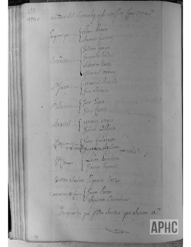 Entre otros asuntos y según la costumbre, se procede al nombramiento de Canicleros de entre los recién casados y una vez sorteados se nombra: Para el arca de Fugenique a Severo Vicente y Antonio Gutiérrez; para Socañete a Julián García, Joaquín Vallés, Severino Eraso y Manuel Jiménez; para San Juan a Manuel Arévalo y José Atienza; para San Sebastián a José Igea y José Castillo; para Araciel a Marcos Oteiza y Julián Delgado; para Burcemay a José Galarreta y Cayetano Arellano; paradera del Molino a Ignacio Pérez; para ministros del Campo a Juan Pastor y Agustín Bienzobas; y para suplentes de dichos cargos se nombra a Juan Gómez, Manuel Sanz, Raimundo Marín, Miguel Delgado, José Muñoz y Lesmes Arellano. (Al final de este acuerdo ya aparecen las firmas de Francisco Ágreda, como Alcalde y Mateo Estañán, Francisco Paula Iniesta, Joaquín Arellano, Miguel Ausejo y Juan Cueva, como Regidores, y la del secretario Domingo Laquidain).