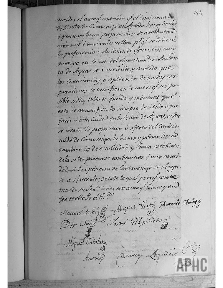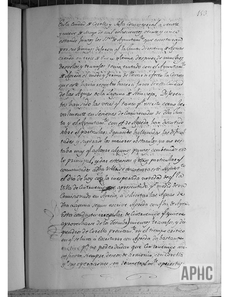 Se informa de gestiones realizadas con el Ayuntamiento de Ágreda, para la cesión de aguas de la Laguna de Añavieja y la noticia de dicho Ayuntamiento de que el de Cintruénigo se ha inmiscuido en el tema, perjudicando las gestiones realizadas por Corella, por lo que comisiona al apoderado José Alonso y dos Regidores, para que se personen en Ágreda y ultimen mediante escritura pública la cesión de aguas de dicha laguna.