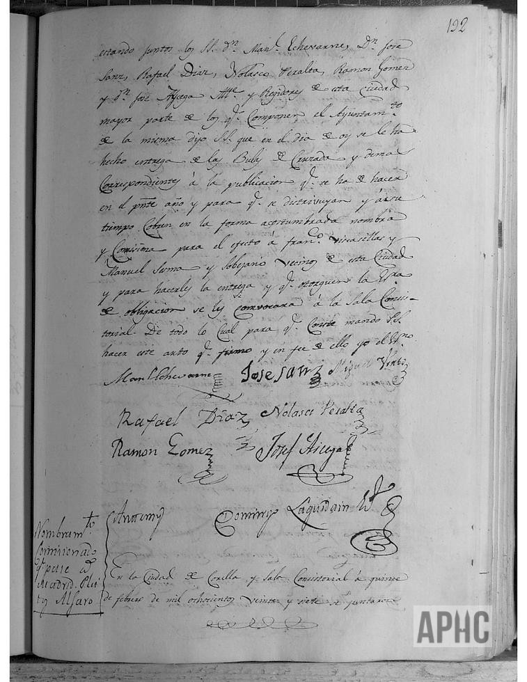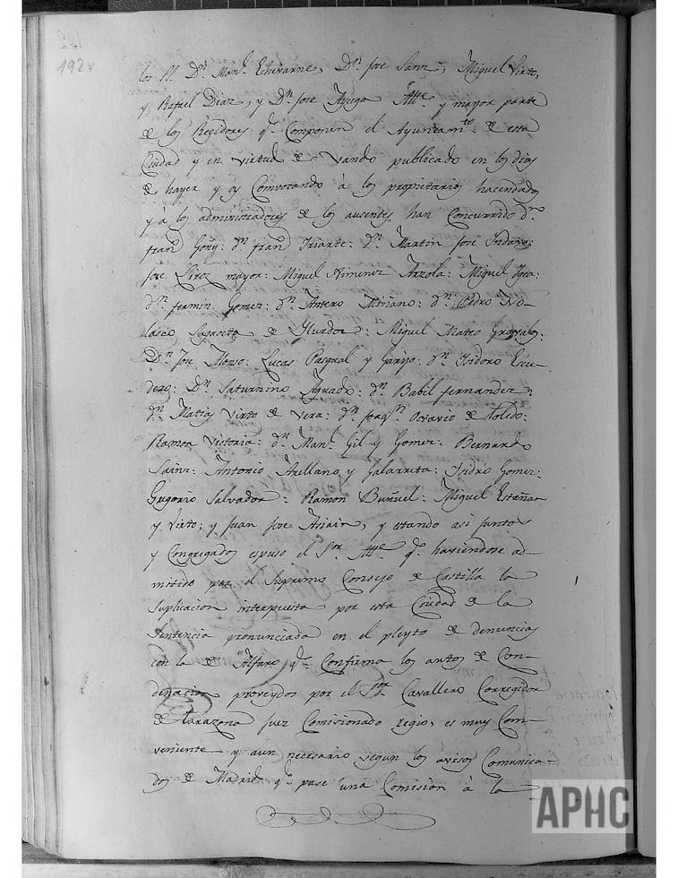 Se juntaron los señores D. Manuel Echevarne, D. José Sanz, Miguel Virto, Rafael Díaz y José Aicega, Alcalde y mayor parte de los Regidores, y en virtud de los correspondientes bandos, asistieron los propietarios hacendados o sus representantes siguientes: D. Francisco Goñi, D. Francisco Iriarte, D. Martín José Indave, José Liroz mayor, Miguel Jiménez Arzola, Miguel Igea, D. Fermín Gómez, D. Antero Miñano, D. Pedro Nolasco Sagaseta de Ilúrdoz, Miguel Mateo Grávalos, D. José Alonso, Lucas Pascual Garijo, D. Isidoro Escudero, D. Saturnino Aguado, D. Babil Fernández, D. Matías Virto de Vera, D. Joaquín Octavio de Toledo, Ramón Victoria, D. Manuel Gil Gómez, Bernardo Sáinz, Antonio Arellano Galarreta, Isidro Gómez, Gregorio Salvador, Ramón Buñuel, Miguel Estañán Virto y Juan José Virto y se informa de la admisión por el Supremo Consejo de Castilla, de la suplicación interpuesta por esta Ciudad, sobre sentencia en el pleito de denuncias con Alfaro, considerando necesario se designe una comisión que pase a Madrid, para las diligencias necesarias, siendo nombrado D. José Alonso que, en caso sufrir de alguna indisposición actuará D. Francisco Goñi.
