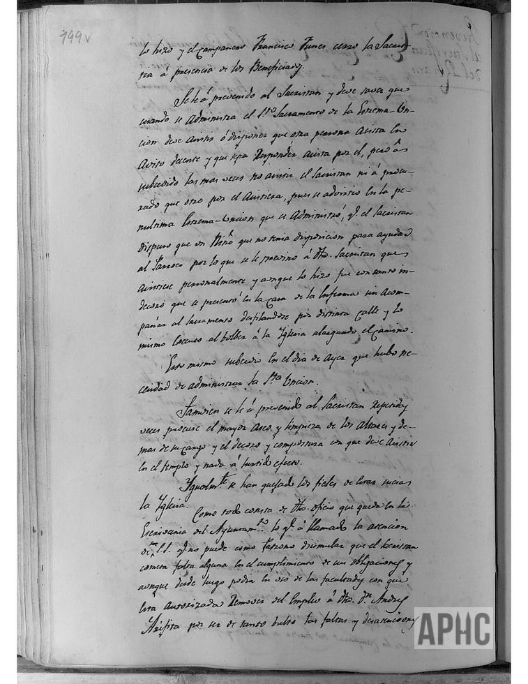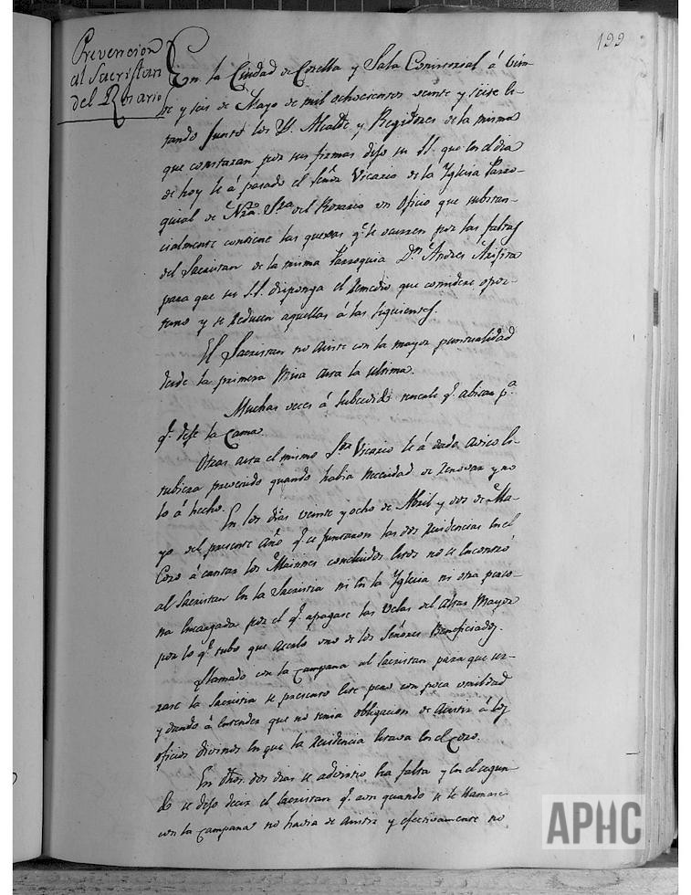 Se informa se ha recibido escrito de quejas del Vicario y Beneficiados de la parroquia de Ntra. Sra. del Rosario, sobre el comportamiento y faltas cometidas por el Sacristán de dicha Parroquia D. Andrés Arigita, y se acuerda notificarle sus obligaciones y en caso contario su destitución, siendo notificado de las mismas. Seguidamente, consta la advertencia comunicado a dicho Sacristán.