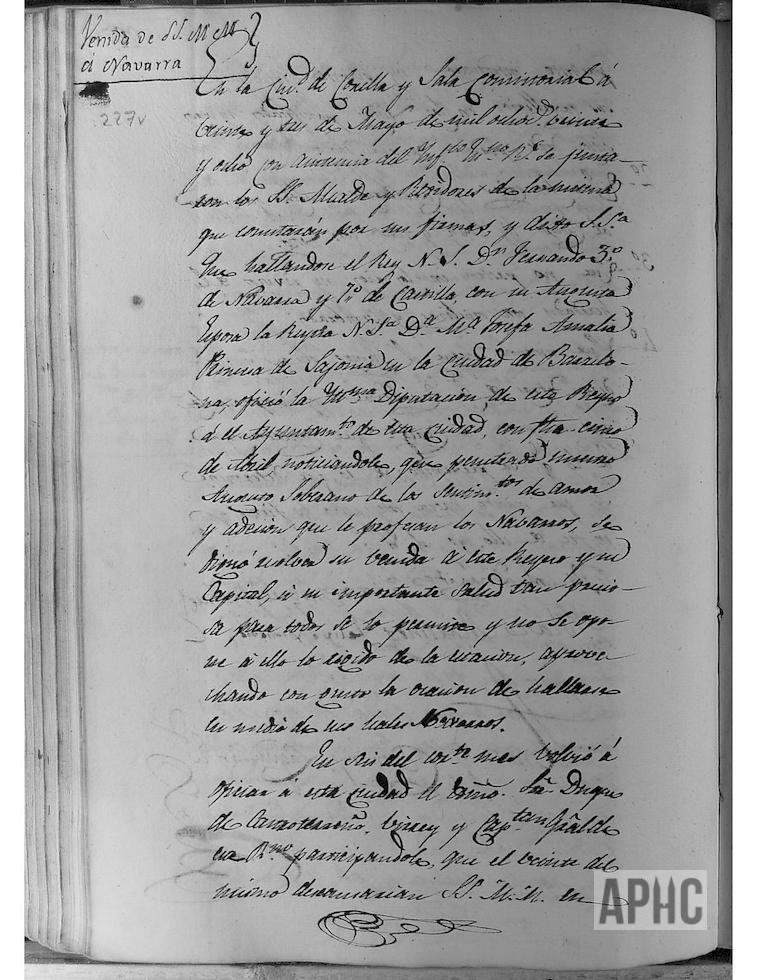 Se hace referencia a la visita del rey Fernando VII de Castilla y III de Navarra, con su esposa Mª Josefa Amalia, Princesa de Sajonia (Fernando VII se casó en cuatro ocasiones) a Tudela, procedente de Barcelona, la cumplimentación del Ayuntamiento de Corella el día 19 de Mayo en Tudela y otros pormenores relativos a este evento, y la salida hacia Tafalla el día 20 de dicho mes de los reyes.