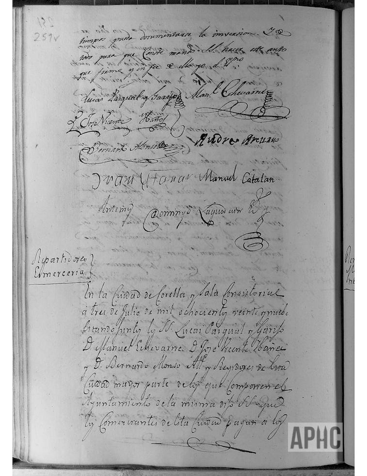 Para hacer el reparto y distribución de la cantidad de 85 ducados con que contribuyen anualmente los comerciantes de esta Ciudad, por el arriendo de las tiendas de exmercería, a plazo de 29 de Septiembre, para el presente año, se nombra a Pascual Soriano, José Salamero, Roque Echeverría Centineda y Antonio Marco.