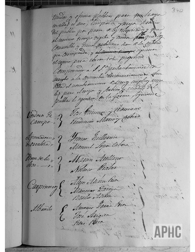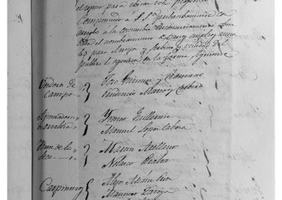 Entre otros asuntos, se procedió al nombramiento de diversos cargos en la forma siguiente: Veedores de Campo, José Jiménez Romano y Prudencio Mateo Cervera; Apreciadores de Hortaliza, Irineo Guillorme y Manuel López Cabeza; Apreciadores de lo Seco, Martín Arellano y Nolasco Peralta; Carpinteros, Alejo Asiain prior, Mauricio Zatoya y Basilio Asiain; Albañiles, Antonio García prior, José Arigita y Pedro Pastor; Zapateros Francisco López prior, Felipe Delgado y Andrés Petit; Alpargateros, José Castillo prior, Pascual Pastor y Prudencio Mateo; Cereros, Francisco Viscasillas prior, Lino García y Ventura Garbayo; Tejedores, Juan Cruz Funes prior, Bruno Ochoa y Miguel Atienza; Sastres, Ramón Cabañas prior, Vicente Francés y Félix Bermejo; Guardas de Montes de Cierzo, Francisco López Peña, José Guillorme Marrón, Matías Ochoa, Manuel Ochoa Mino?, Matías Navarro y Manuel Catalán Tropiezo. Asimismo para evitar abusos en pesas y medidas sin referirlas con las originales, se acuerda la publicación de bando, para que lleven las de madera a casa de Mauricio Zatoya, maestro carpintero y las de hierro a la de Gregorio Garbayo, maestro cerrajero.