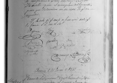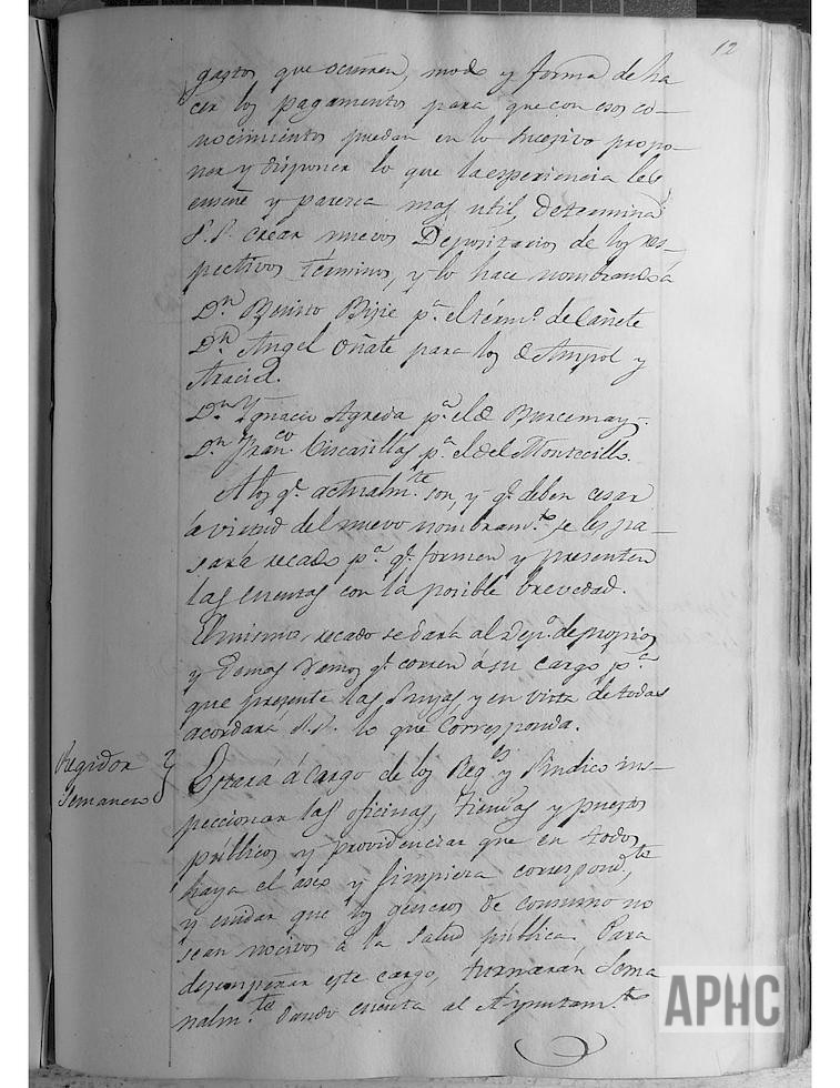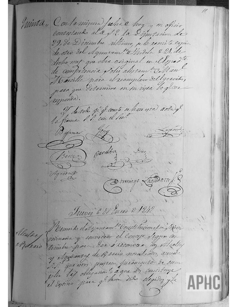 Reunido Ayuntamiento y el Concejo, según costumbre, para dar a conocer los Alcaldes y Ayudantes de Barrio nombrados y se acuerda que estos presten juramento de cumplir las obligaciones del cargo. Disponiendo una de las condiciones con que se arrienda el impuesto o Sisa al vino que se consume por menor, que se afore en principio de año todo el que tenga la población, se comisiona al Capitular Anselmo Peralta, para que acompañado de las personas que han de dar las razones correspondientes y citación del arrendador que ha de cobrar dicho impuesto, formalice el aforo. Escrito del Cabildo Eclesiástico de las dos Parroquias, haciendo saber que a su Presidente, le comunica el Gobernador Eclesiástico de Tarazona, haga constar su buena conducta política y adhesión al Gobierno y determina se le provea al Cabildo el certificado que solicita para que pueda acreditarlo. Para que se vayan instruyendo en los derechos de las aguas métodos y otros pormenores de los términos en que se halla dividido el regadío de la Población, para que en lo sucesivo y con su experiencia propongan lo más interesante y razonable, se nombra a Benito Bissié, para el término de Cañete y a Ángel Oñate para los términos de Ampol y Araciel, a Ignacio Ágreda para el de Burcemay y a Francisco Viscasillas para el del Montecillo. A los nombrados y a los que deben cesar se les pasará comunicación, para que presentes las correspondientes cuentas. Los Regidores y el Procurador Síndico, inspeccionarán las oficinas, tiendas y puestos públicos y providenciar que en todos halla el aseo y limpieza correspondiente y cuidar que los géneros de consumo, no sean nocivos a la salud pública. Para este desempeño, se turnarán semanalmente, dando cuenta al Ayuntamiento de cuanto les parezca debe tener conocimiento para disponer lo conveniente.