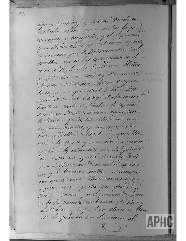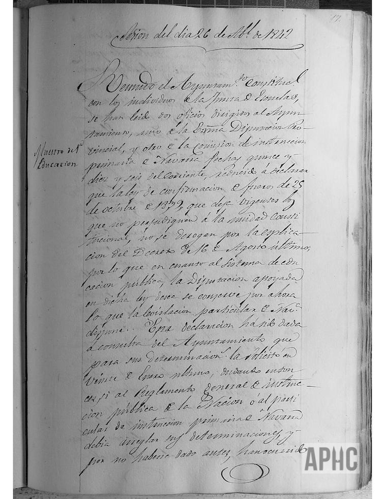 Respuesta de la Diputación Provincial a consulta del Ayuntamiento sobre el Reglamento se debe aplicarse sobre Educación. Asunto del Maestro Marcos Antonio Oyamburu y la Maestra (no cita nombre, entiendo es Mª Francisca Sánchez).