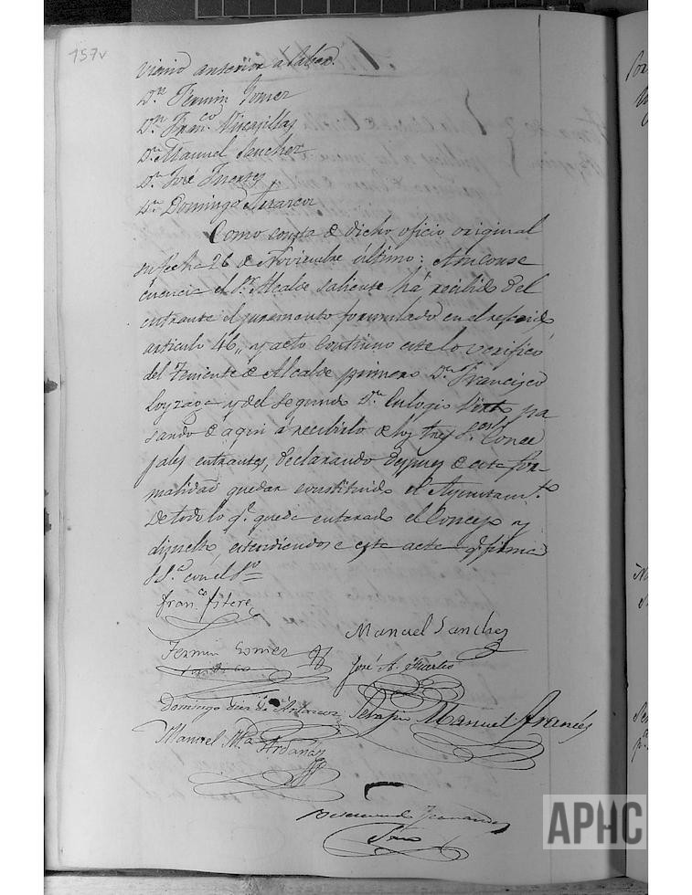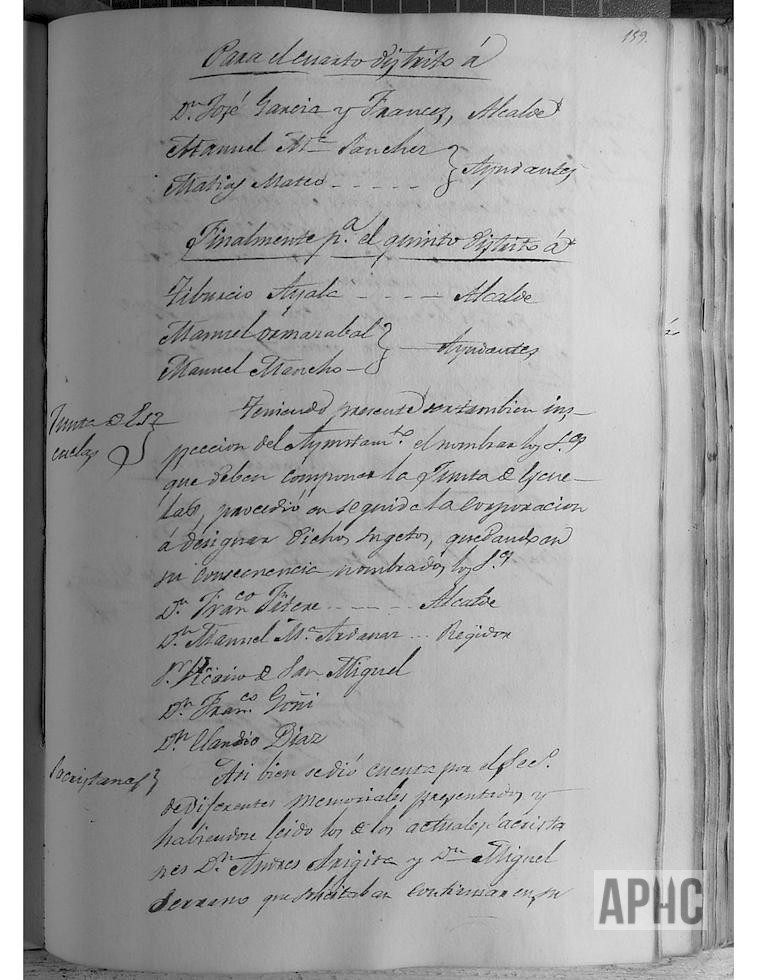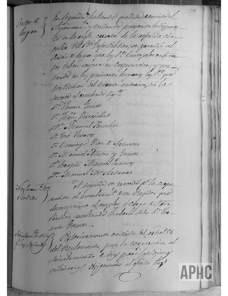 Se procede a la toma de posesión y jura de su cargo del nuevo Ayuntamiento, quedando constituido por: Alcalde, Francisco Fitere, Tte. 1º Francisco Loyzaga, Tte. 2º Eulogio Virto y Concejales: Serapio Manuel Francés, Manuel Mª Ardanaz, Manuel Mateo Gómez y los anteriores concejales Fermín Gómez, Francisco Viscasillas, Manuel Sánchez, José Fuertes y Domingo Artazcoz.Se procede a sorteo de lugar a ocupar en las sesiones, con el resultado siguiente: Fermín Gómez, Francisco Viscasillas, Manuel Sánchez, José Fuertes, Domingo Díez de Artázcoz, Manuel Mateo Gómez, Serapio Manuel Francés y Manuel María Ardánaz. Se nombra al Regidor para el cargo de Procurador Síndico, siendo elegido Fermín Gómez. Se acuerda la celebración de las sesiones ordinarias, los miércoles y sábados a las 6 de la tarde en invierno y a las 10 de la mañana una vez mejorado el tiempo. Se procede al nombramiento de Alcaldes y Ayudantes de Barrio, resultando para el Primer Distrito, Ramón Salcedo, alcalde y León Eraso, Bruno Ochoa y Benito Estañán, ayudantes; para el 2º Distrito, Pedro Nolasco Estañán, alcalde y Carlos Arnedo, Manuel Alfaro y Juan López, ayudantes; para el 3º Distrito, Benito Mateo, alcalde y Ramón Planillo, Ventura Jiménez y Baltasar Liroz, ayudantes; para el 4º Distrito, José García Francés, alcalde y Manuel Mª Sánchez y Matías Mateo, ayudantes; y para el 5º Distrito, a Tiburcio Ayala, alcalde y Manuel Ormazábal y Manuel Mancho, ayudantes. Para la Junta de Escuelas, se nombra a los señores Francisco Fitere, Manuel Mª Ardanaz, Vicario de San Miguel, Francisco Goñi y Claudio Díaz. Se accede a la solicitud de los actuales Sacristanes Andrés Arigita y Miguel Serrano, para que continúen en su cargo. Se nombra por maestro albañil a Mariano García y por maestros carpinteros cerrajeros a Mariano Gil y Eugenio Escudero, siendo estos dos últimos los Referidores de pesas y medidas.