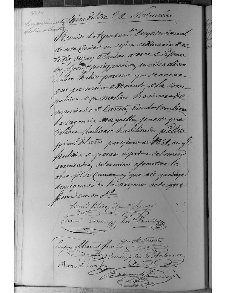 Por no encontrar persona que por el remate, reparase el Molino de Cañete, que debía hallarse habilitado para comienzos del año próximo, en que debía pasar a un nuevo arrendador, el Ayuntamiento acordó ejecutar la obra por su cuenta y que así quedase consignado. (Creo que quiere decir que la obra se realiza a cuenta del próximo arrendador del molino).