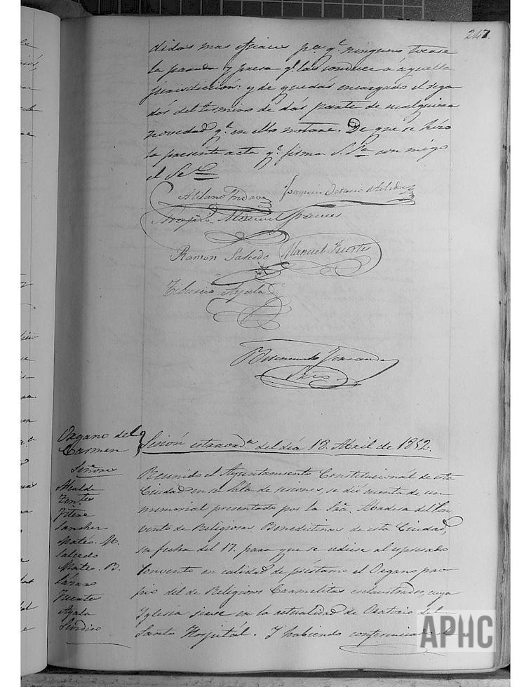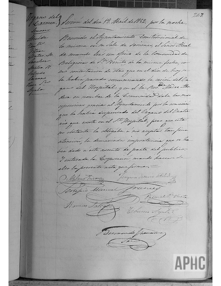 Petición de las Monjas de San Benito para que se les prestase el órgano de los Carmelitas; se accede en calidad de préstamo. (Creo que se trata del órgano del Oratorio del Hospital y no el del Carmen). La Abadesa de San Benito, agradece el préstamo del órgano del Oratorio del Hospital, pero no acepta dicha atención en vista de la importancia que se había dado a este asunto por parte del público.