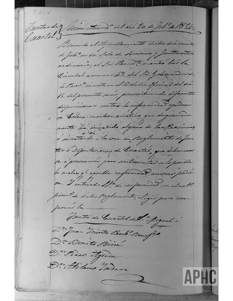 Nombramientos de vocales de Juntas de Cuartel de la Parroquia de Ntra. Sra. del Rosario y de la de San Miguel, para contrarrestar en lo posible la enfermedad del cólera morbo; quedando constituidas del siguiente modo: Junta de San Miguel, formada por Juan Iniesta, presbítero beneficiado, Benito Bisié, Pedro Ágreda y Atilano Indave; Junta del Rosario, formada por Manuel Marcilla, presbítero beneficiado, Domingo Díez de Artázcoz, Manuel Mª Sesma y Manuel Mª Ardanaz.