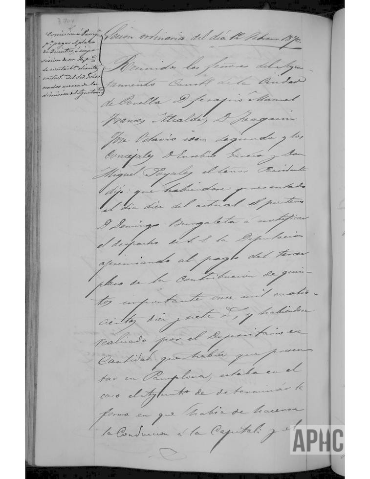 Estando disponible la cantidad de 11.417 reales, para pago del tercer plazo de la contribución de Quintos, se consideró oportuno que se desplazase a Pamplona el Depositario, para abonar dicha cantidad y evitar el incremento de costas. Se recibe contestación del Gobernador, al escrito de dimisión del Ayuntamiento, indicando que podían dirigirse a la Diputación Provincial, a la que correspondía el asunto.