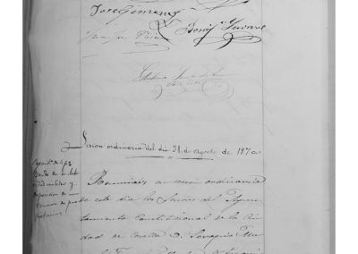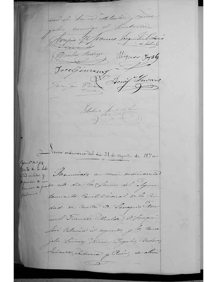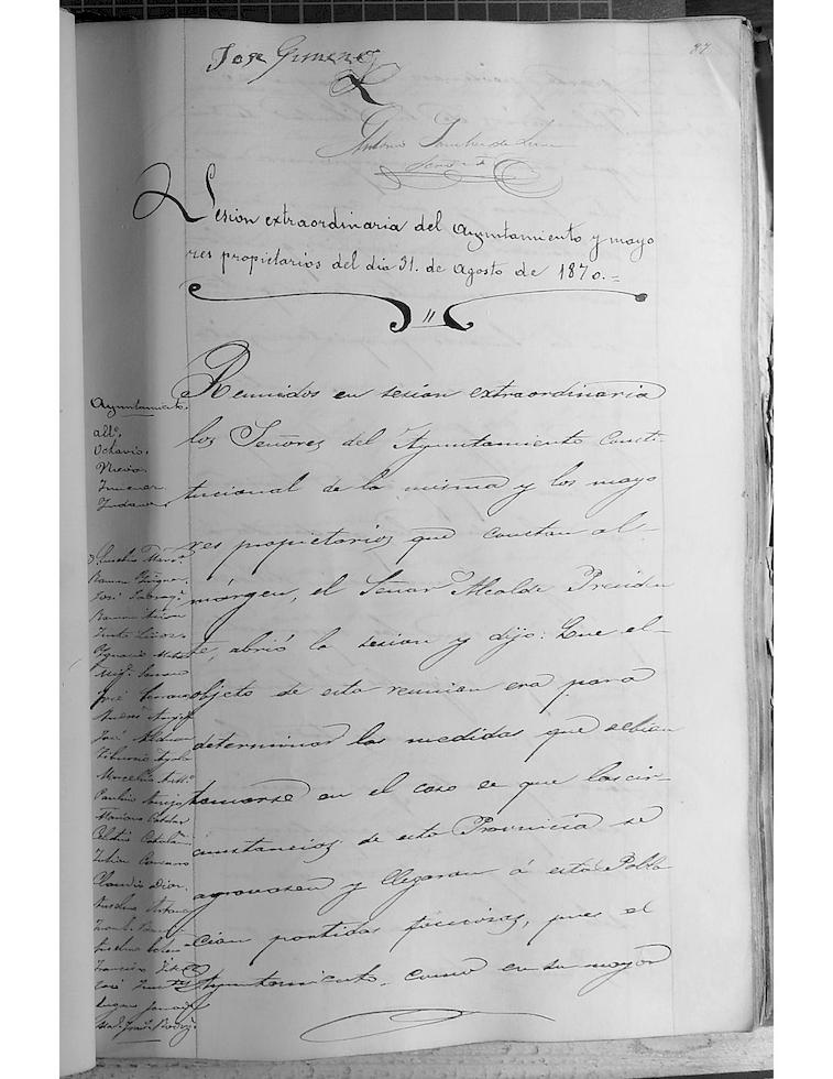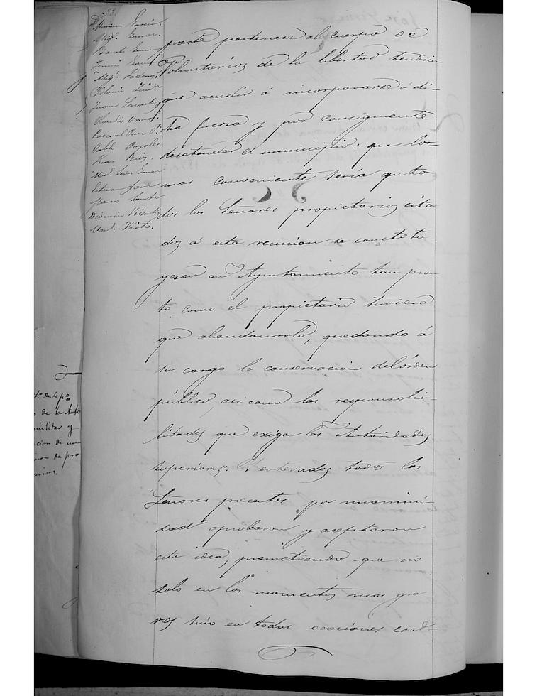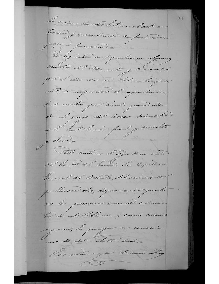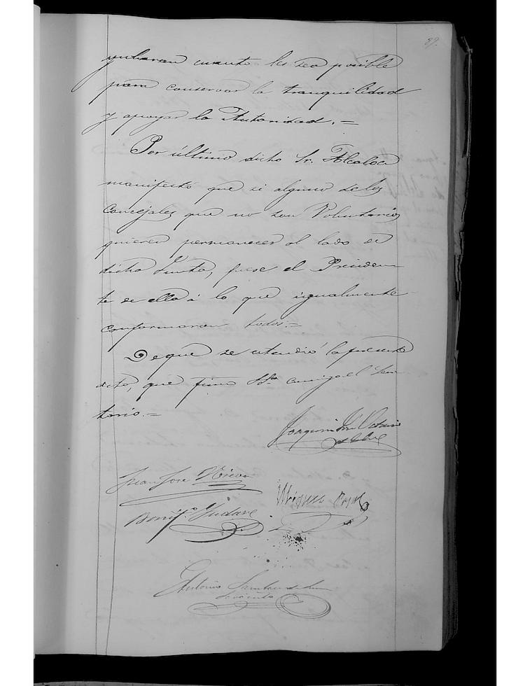 Entre otros asuntos, se dispone publicación de un bando, a raíz de otro del Capitán General del Distrito, comunicando a la población que tanto al ausentarse de la Población, como el regresar, deben ponerlo en conocimiento de la Autoridad. En atención a las circunstancias por las que atraviesa la Provincia, se acuerda una reunión con los mayores Contribuyentes, por si el Ayuntamiento se viese forzado a abandonar su puesto y ocupar el puesto que como Voluntarios de la Libertad les corresponde, y quedasen ellos encargados de mantener en cuanto les fuera posible el orden público. Ese mismo día, se celebra sesión extraordinaria con los Mayores Contribuyentes, exponiendo lo ya tratado en sesión municipal, encontrando la idea de total conformidad y añadiendo al Alcalde que si alguno de los Concejales que no eran Voluntarios, quisieran permanecer al lado de dicha Junta, fuese el Presidente de la misma, estando todos los presentes de acuerdo.