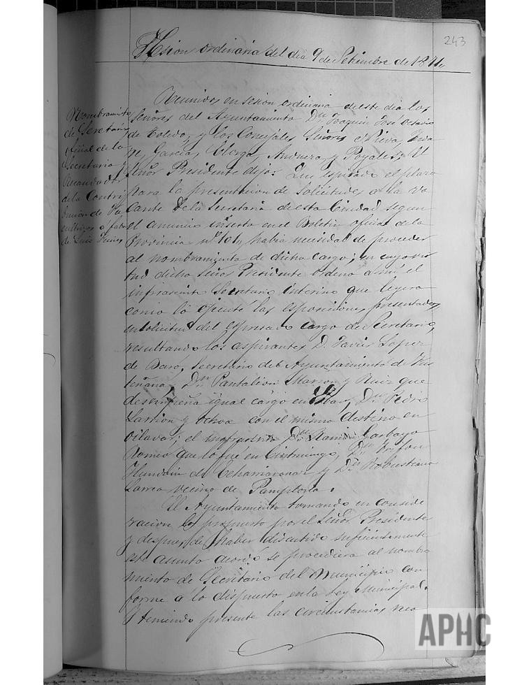 Se da lectura a las solicitudes para el cargo de Secretario, resultando las de Javier López de Baro, secretario de Fustiñana; Pantaleón Marcos Ruiz; Pedro Larrión Ochoa, secretario en Oilavar; Ramón Garbayo Romeo, que fue secretario en Cintruénigo; Trifón Ilundain, de Echarri Aranaz y Robustiano Larra, vecino de Pamplona. Se elige por unanimidad de Ramón Garbayo Romeo, con la dotación de 6.000 reales anuales, pagados por trimestres. El cargo es aceptado por el nombrado. También se nombra Oficial de Secretaria al aspirante Manuel Echevarne, con sueldo de 2.555 reales, cargo que aceptó. Se nombra recaudador de la contribución de los médicos a Luis Funes.
