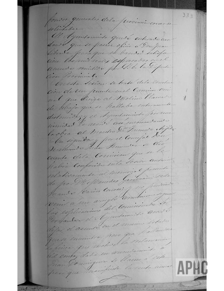 Sobre la aprobación de cuentas de suministros presentadas por el encargado en 1868 Juan Librada y el acuerdo tomado por este Municipio por el que se determinó que Juan Librada pagase a los fondos municipales 1.000 reales. Se acuerda pasar notificación a Juan Librada para que pague dicha cantidad. Contestación de la Diputación sobre gastos ocasionados por Voluntarios de la Libertad, en el sentido de que si eran reintegrables al Municipio, pero se desconocía el modo y que no se pronunciaba en cuanto a si eran a cargo de los fondos generales de la Provincia. Se encarga al Maestro Facundo Arigita, la construcción de un puente en el camino vecinal que se dirige el Molino llamado de Abajo, por estar destruido dicho puente. El concejal Beremundo Juan Fernández expone que se había entrevistado con Mercedes Garisoain, sobre reclamación que formulaba sobre cesión de terreno para construcción de heleras para el Municipio, no llegando a un acuerdo dejando el asunto como estaba, pero que al estar dicha finca en arriendo a Juan Domínguez, se cita a este para que diga la renta que paga y el tiempo por la que lo arrendó, para ver si se puede resolver el tema de forma que convenga a la municipalidad.