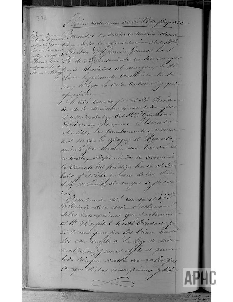 Presentación de la dimisión como Administrador del Hospital el recién nombrado Ramón Jiménez, siendo admitida en orden a las razones que expone (las cuales no se indican). Se acuerda el anuncio público de dicha vacante. Se conoce la relación de bienes del Santo Hospital, vendidos con arreglo a la ley de desamortización, así como otras que corresponden al Municipio. Ante la presentación de cuentas del que fue Depositario de propios y rentas y Administrador del Hospital, Pablo Campos, se designan tres comisionados para el examen de dichas cuentas. Se acuerda que se anuncie el arriendo del local de la carnicería y la venta de leña existente en el camino que dirige a la Laguna.