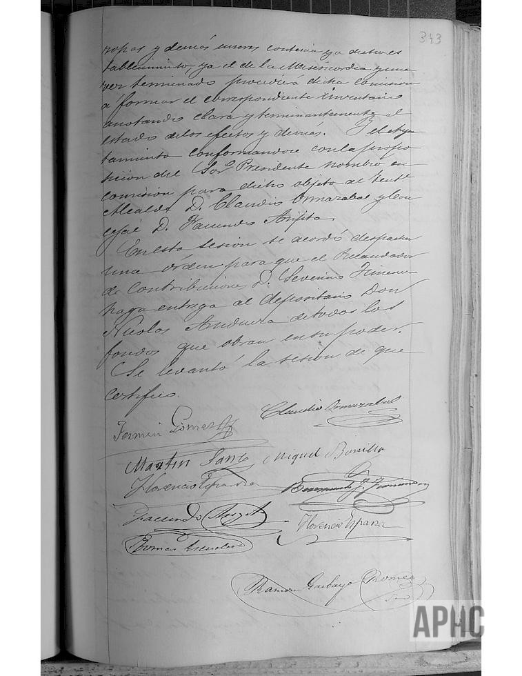 Se nombra comisión para realizar inventario de ropas y enseres del Hospital y de la Misericordia. Se acuerda que el Recaudador de Contribuciones Severino Jiménez, entregue al Depositario Nicolás Andueza, los fondos que obren en su poder.