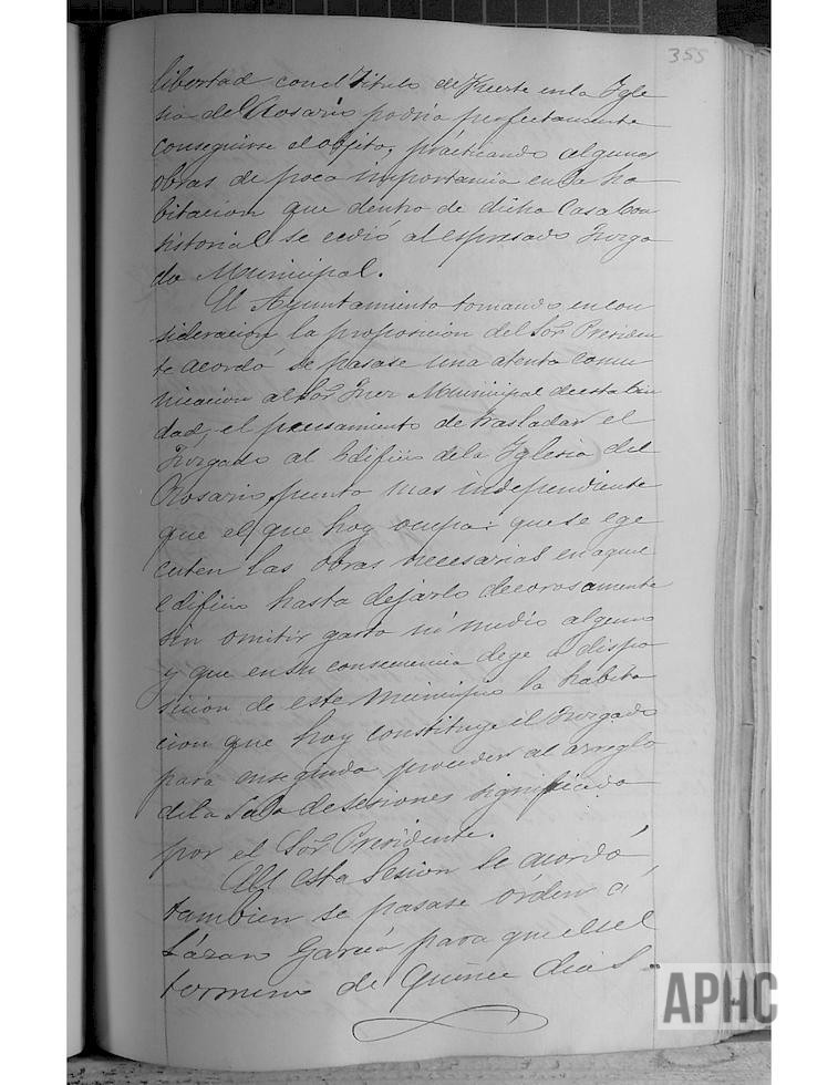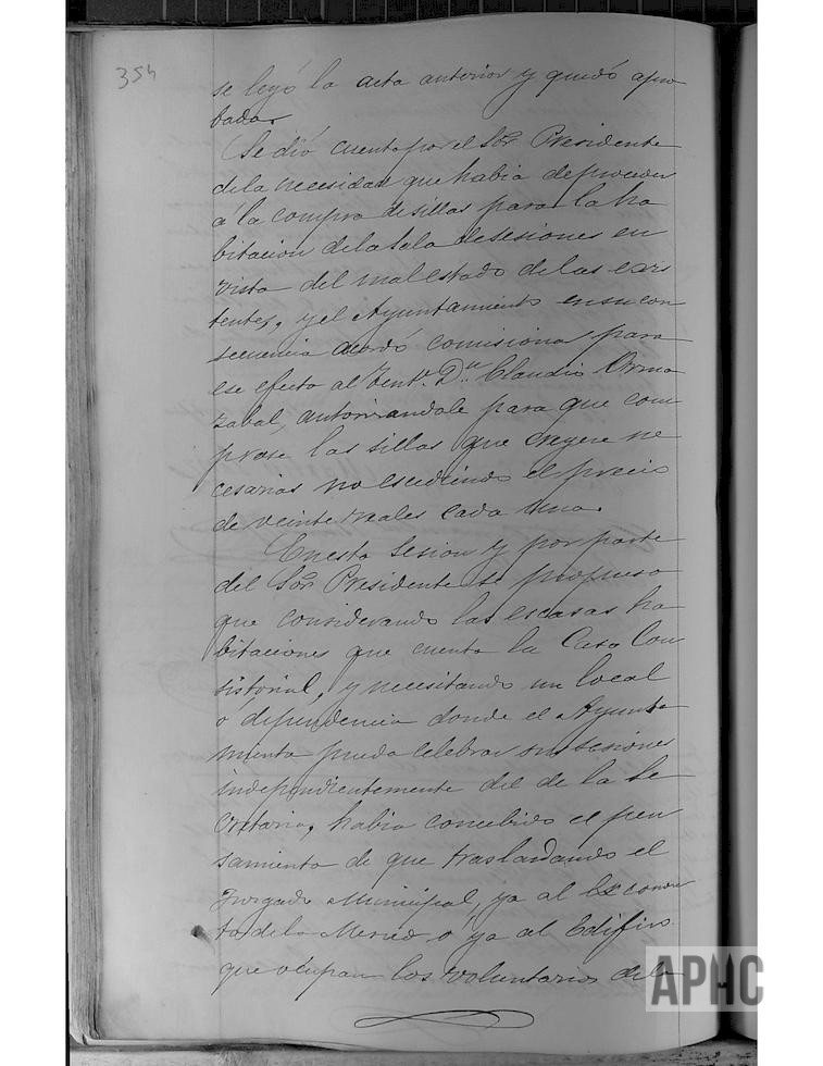 Se autoriza la compra de sillas para el salón de sesiones, no debiendo exceder del precio de 20 reales la unidad. Se considera conveniente que para la celebración de sesiones de la Corporación, se cuente con salón propio, independiente de la habitación de la Secretaría, se traslade el Juzgado Municipal al exconvento de la Merced o al edificio de la iglesia de Ntra. Sra. del Rosario, siendo más independiente al que ahora ocupa, pudiendo ser utilizado el de la Casa Consistorial para las sesiones corporativas, acordando se realicen las obras oportunas en ambas habitaciones.Se acuerda ordenar a Lázaro García, que en plazo de 15 días, desocupe el piso que ocupa en el exconvento de la Merced, por necesitarlo el Ayuntamiento.