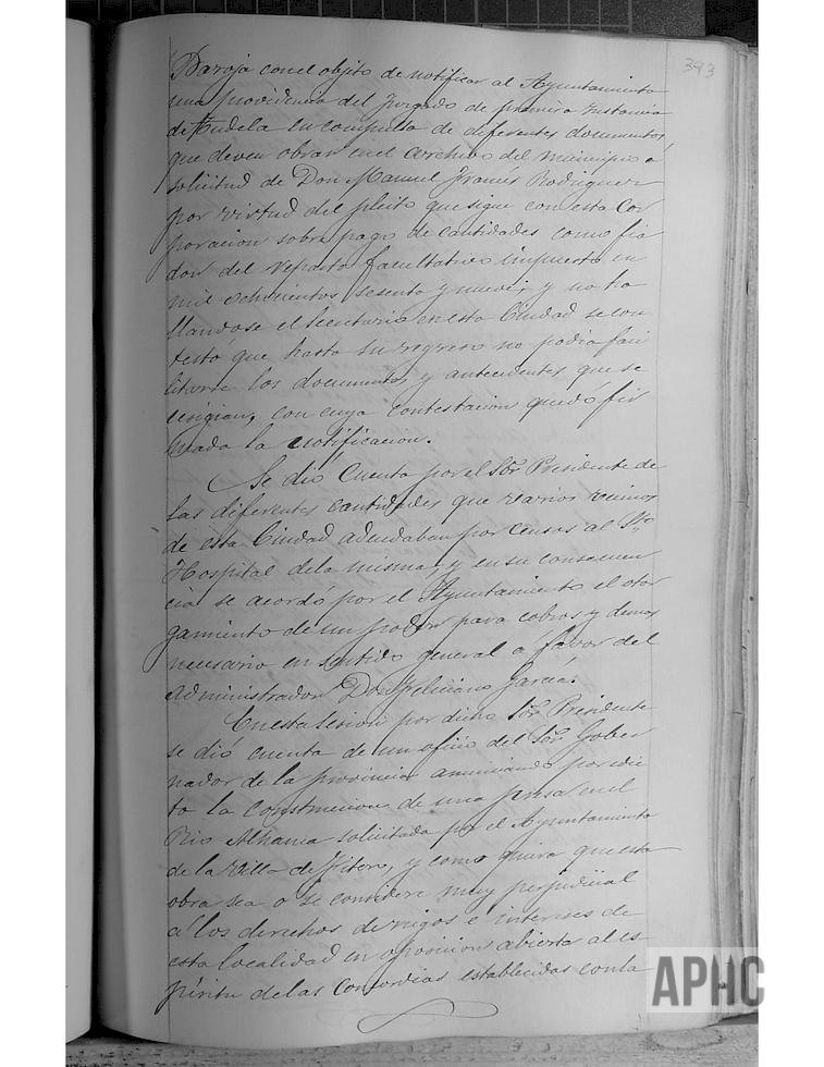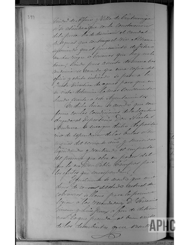 El secretario del Juzgado Municipal, Manuel Mª Ardánaz, se presentó acompañado del letrado Juan Esteban Baroja, con una Providencia del Juzgado de Primera Instancia de Tudela, en consulta de diferentes documentos que deben obrar en el Archivo del Ayuntamiento, en solicitud de Manuel Francés Rodríguez, por pleito que tiene contra este Ayuntamiento. No hallándose el Secretario del Ayuntamiento en la Ciudad, se contesta que hasta su regreso no pueden facilitarse los documentos requeridos. Ante las deudas de varios vecinos con el Hospital, se autoriza al Administrador Feliciano García, para que que pueda realizar los cobros. Se recibe Oficio del Gobernador, sobre intención del Ayuntamiento de Fitero de construcción de una presa en el río Alhama y ante los posibles intereses de Corella, Alfaro y Cintruénigo, se comunicaba para las reclamaciones oportunas, ya que Fitero pretendía regar nuevos terrenos y supondría una merma de las aguas del río Alhama. Se traslada copia del Oficio a la Junta Directiva de Aguas, para que determinen lo conveniente y lo manifiesten al Ayuntamiento. Se acuerda que el Depositario, Nicolás Andueza, se encargue de la expedición de bulas y sumarios del corriente año y siguientes y que reciba el importe que pueda tener el anterior Depositario, Pablo Campos, a los efectos que correspondan. Se acuerda citar para la próxima sesión a los recaudadores Severino Jiménez y Luis Funes, para que informen sobre lo recaudado, en orden a previsiones de pagos.