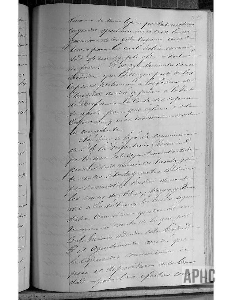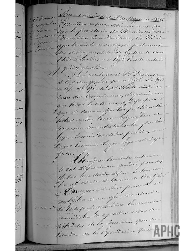 Se informa de Orden General del General Jefe del Ejército del Norte, disponiendo que las averías y desperfectos causados por las partidas carlistas en las líneas telegráficas, se reparasen inmediatamente por los Ayuntamientos de los pueblos, en cuyo término tenga lugar el desperfecto. Enterado el Ayuntamiento dispone se comunique dicha orden al alcalde del Barrio de Castejón. Se comisiona el teniente alcalde Martín Sanz, parea asistir en Tudela a reunión sobre impagos producidos por los pueblos en cuanto al reparto del importe del suministro de raciones extraordinarias de carne y vino que se dan a las tropas. Información sobre cobro de cupones del Tesoro y se acuerda pase a la Junta de Beneficencia, ya que los cupones pertenecen al Hospital. Comunicación de la Diputación sobre cantidad a favor del Ayuntamiento, por suministros realizados los meses de abril, mayo y junio del pasado año.