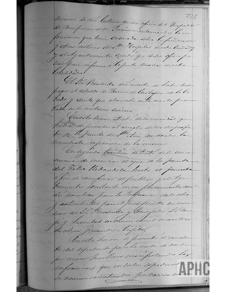 Se informa de escrito remitido al Obispo de Tarazona, para nombramiento de Capellán para el Santo Hospital. Se informa de reclamación del Inspector de Beneficencia, sobre información que tenía solicitada respecto al Santo Hospital de esta Ciudad, y se acuerda que ficho oficio pasase a la Junta auxiliar de Beneficencia de la Ciudad.- Se informa de haberse realizado al abono oportuno al alcalde de barrio de Castejón, por suministro realizado al destacamento de la fuerza de dicho barrio.- Se acuerda el arreglo de los desperfectos de la Fuente de Santa Ana. Se trató de la conveniencia de encauzar las aguas de la Fuente del Tollo hasta el puente (sobre el río Alhama), a fin de beneficiar al público y el Ayuntamiento acuerda comisionar para estudio e informe al Alcalde, a los Concejales Baroja y Lasantas y al Maestro de Obras Facundo Arigita. El rematante del expediente para la venta de aceite al por menor, Juan Ríos, manifiesta las infracciones que se vienen cometiendo, vendiendo aceite por menor, en perjuicio de sus intereses, entre ellos Celestino Arigita, quien en el mismo día justificaría la venta. El Ayuntamiento acuerda recaban información para resolver como proceda en justicia.