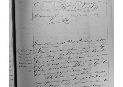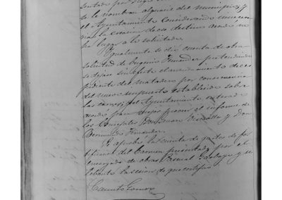 El Concejal Juan Esteban Baroja, presenta la dimisión, en virtud de lo dispuesto en párrafo último del artículo 39 de la Ley Municipal, el Ayuntamiento, acordó que se reflejase el siguiente memorial: “No pudiendo aplicarse en el presente caso, lo dispuesto en el final del artículo 39 de la Ley Municipal vigente, no ha lugar a lo que se solicita por el concejal Juan Esteban Baroja, en la anterior instancia”. Escrito de Diego González, solicitando el cargo de Alguacil del Municipio; el Ayuntamiento considerando innecesaria la creación de ese cargo, acuerda no ha lugar a lo solicitado. Escrito de Eugenio Fernández, solicitando se dejase sin efecto el arrendamiento del matadero, como consecuencia del nuevo impuesto establecido sobre las carnes; el Ayuntamiento acuerdo solicitar informe de los Concejales Jenaro Viscasillas y Veremundo J. Fernández, sobre este asunto. Se aprueba la cuenta presentada por el Maestro de Obras Pascual Garbayo, por gastos de fortificación del Carmen.