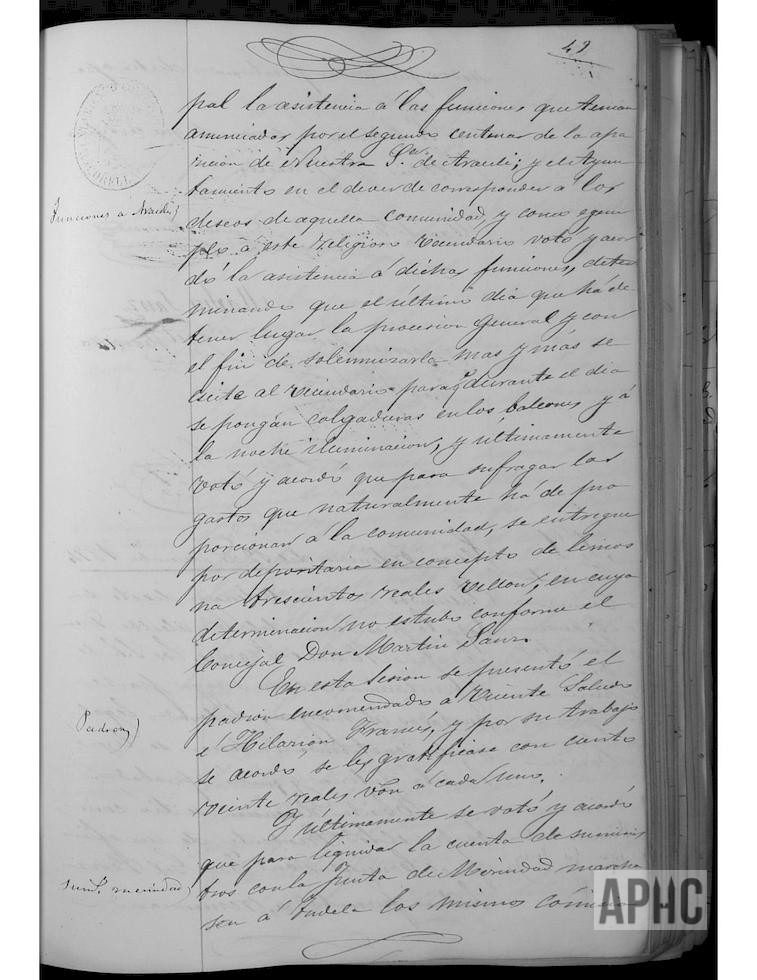 Invitación de la Comunidad de Religiosas Carmelitas de Araceli, a los actos con motivo del Segundo Centenario de la aparición de Ntra. Sra. de Araceli; el Ayuntamiento acuerda su asistencia, celebración especial el día de la procesión y conceder a dicha Comunidad 300 reales para atención de los gastos ocasionados. Se acusa recibo del padrón encomendado a Vicente Salcedo e Hilarión Francés, acordando que por dicho trabajo se les bonifique con 120 reales a cada uno. Se acuerda que para liquidar la cuenta de suministros con la Junta de la Merindad, se comisiona a los concejales que venían interviniendo en dicha liquidación.