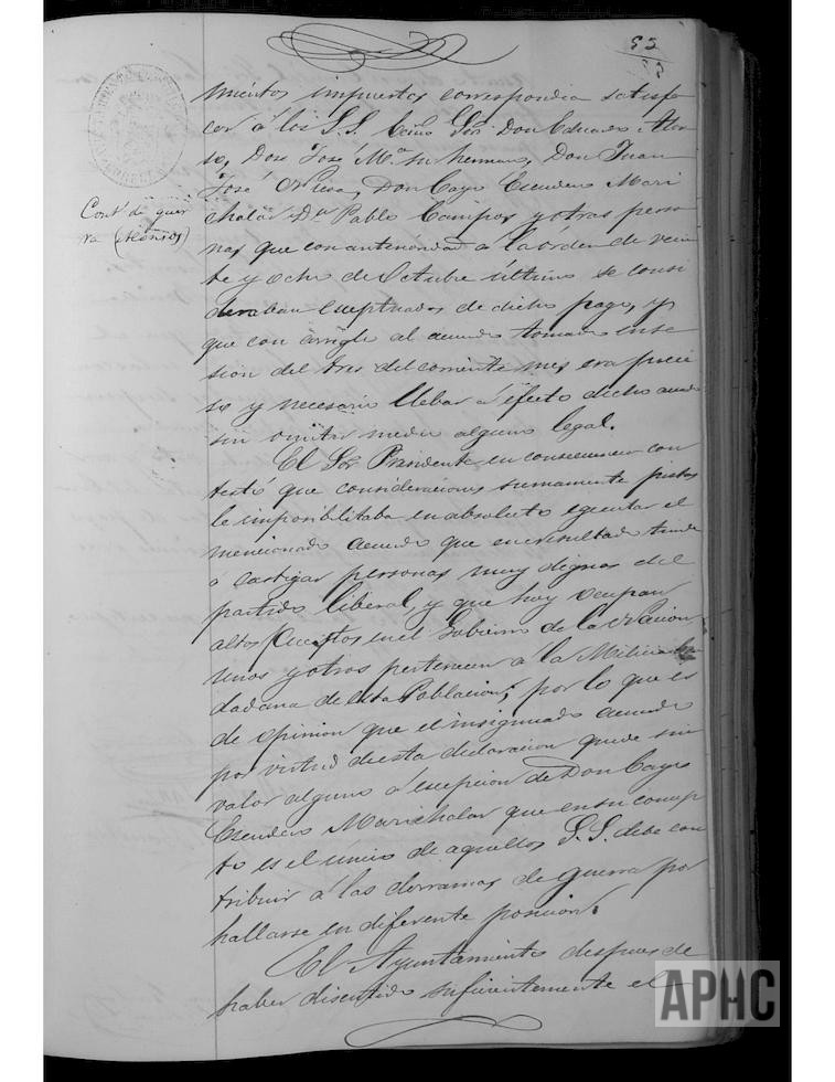 Los Concejales Ruperto Azanza e Ildefonso Díaz, exponen al alcalde que manifieste el estado del cobro de las cuotas que por contribuciones de guerra en los repartimientos impuestos, correspondía satisfacer a los Sres. Eduardo Alonso Colmenares y su hermano José Mª, Juan José Nieva, Cayo Escudero Marichalar, Pablo Campos y otras personas que con anterioridad se consideraban exentas de dichos pagos y que en anterior sesión se acordó llevar a efecto su cobro. El Alcalde indica que resulta muy difícil sancionar con dicho castigo a personas muy dignas del partido liberal y que hoy ocupan altos cargos en el Gobierno de la Nación y otros que pertenecen a la Milicia Ciudadana de esta Población, manifestando la opinión de que dicho acuerdo quede sin valor alguno, a excepción de lo referido a Cayo Escudero Marichalar, por hallarse en diferente posición. Después de varias deliberaciones se optó por dejar sin efectos el referido acuerdo. Los Concejales Lasantas, Azanza y Díaz votaron contrarios a la anulación de dicho acuerdo, exceptuando únicamente del pago a Eduardo Alonso
