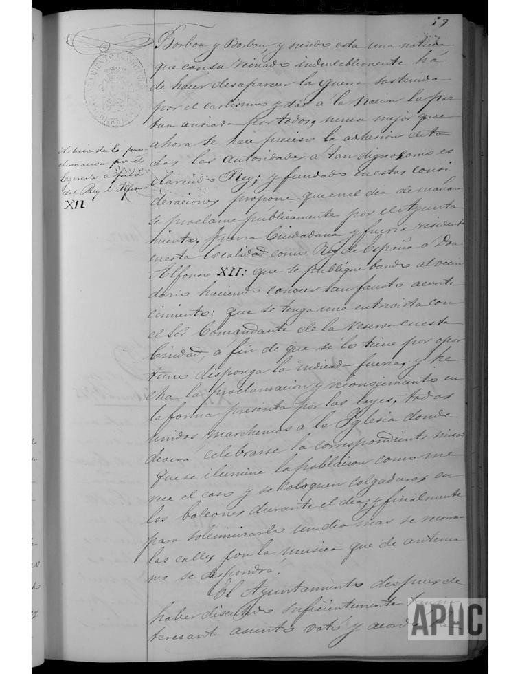 El Alcalde-Presidente informa de la proclamación, por todo el Ejército Español y varias poblaciones, como Rey de España a Alfonso de Borbón y Borbón, expresando sus deseos de que este reinado acabe con la guerra y traiga la paz a la nación, proponiendo que mañana se proclame públicamente en esta Localidad como Rey de España a Alfonso XII, disponiendo los actos oportunos para dicha celebración.